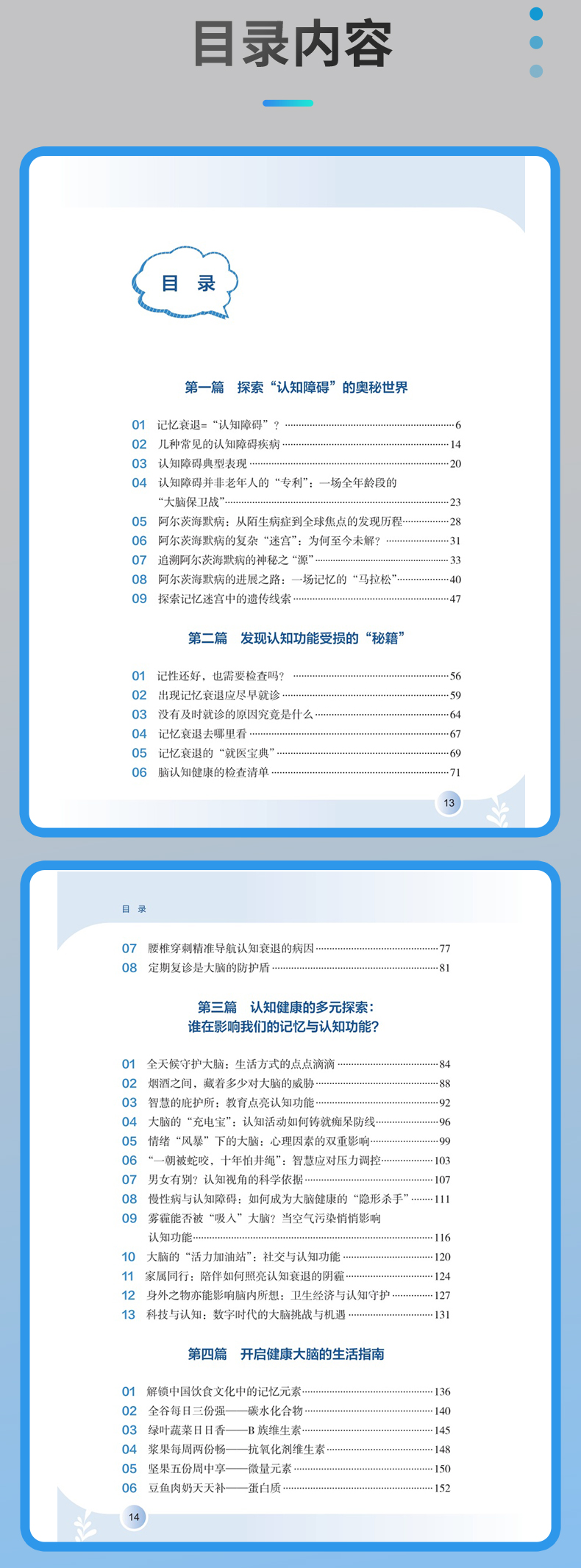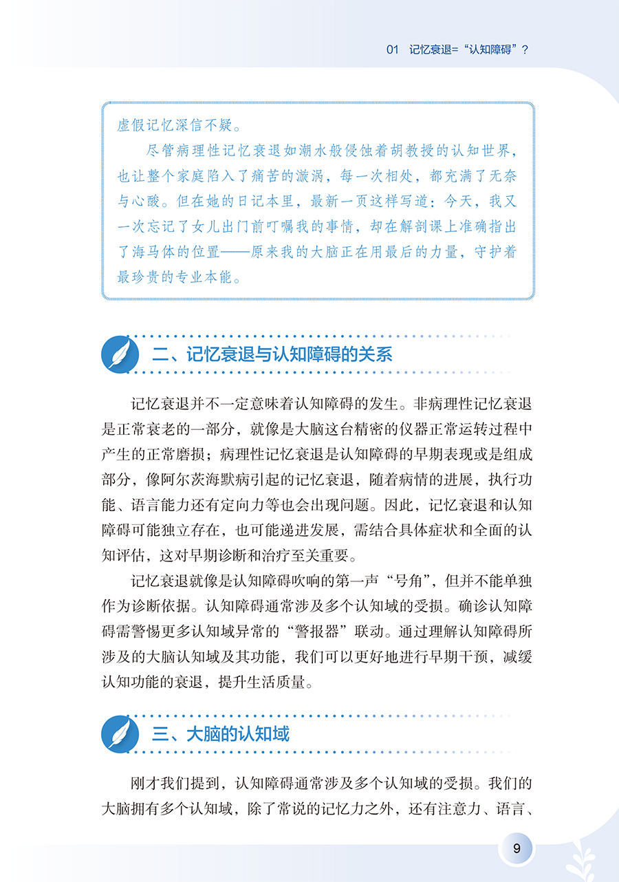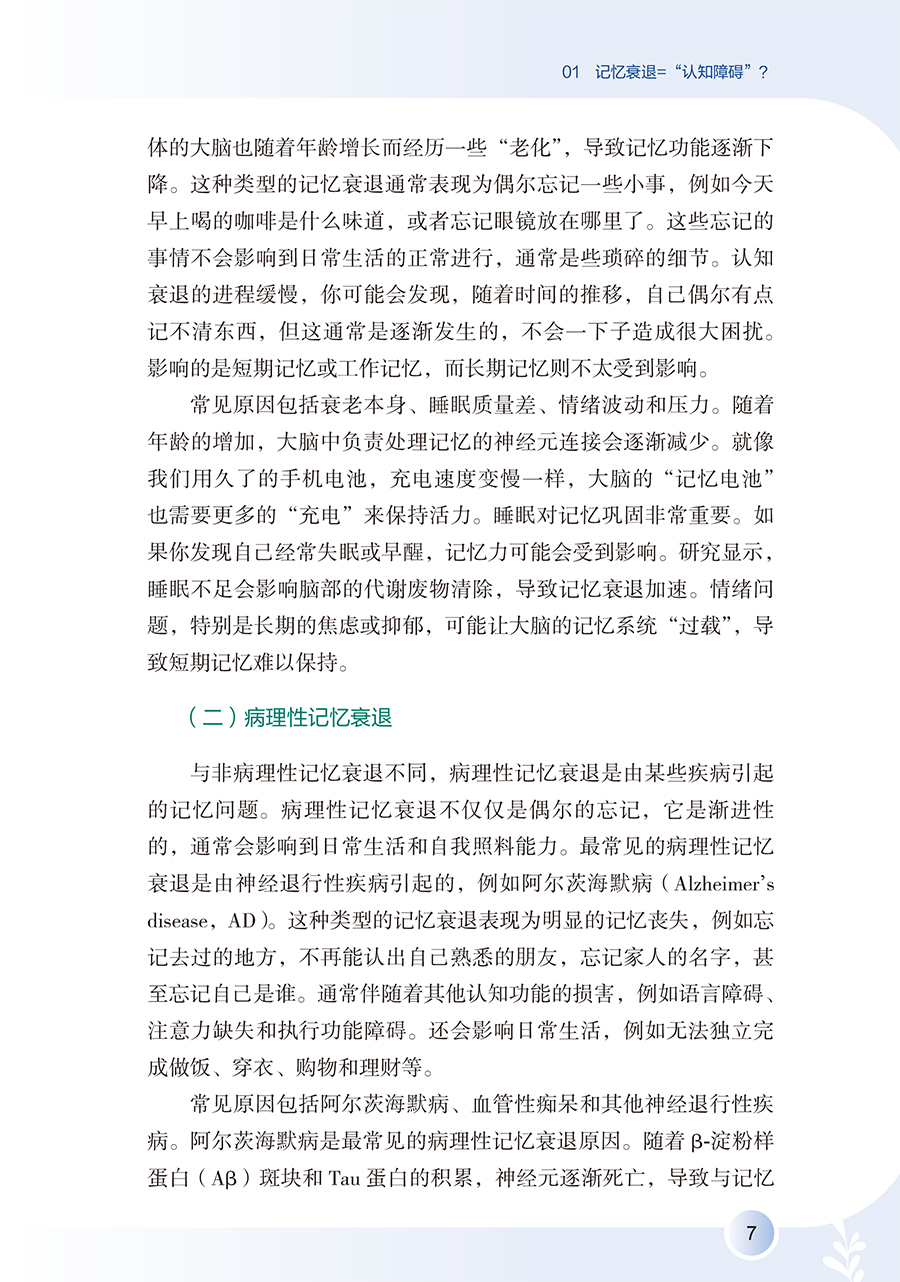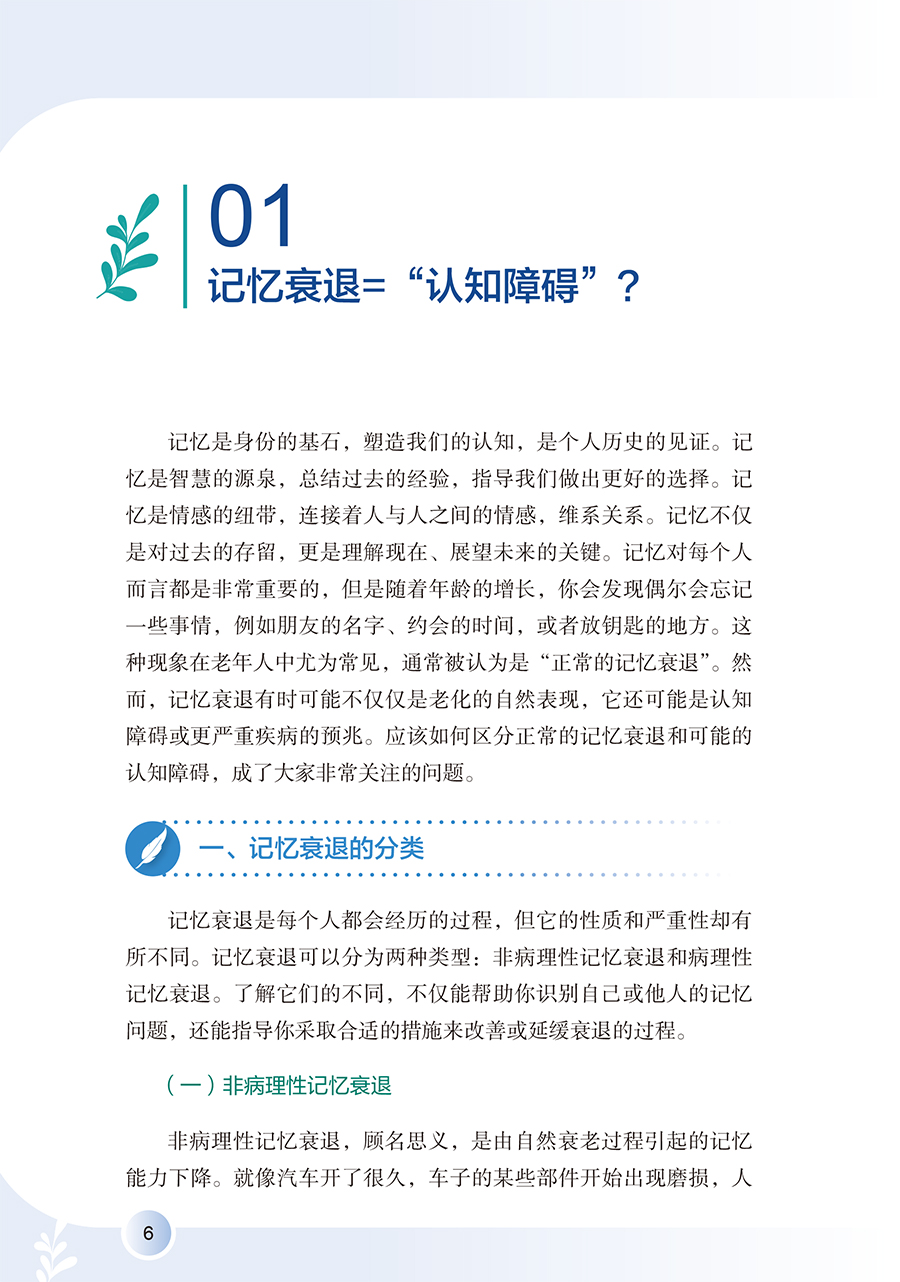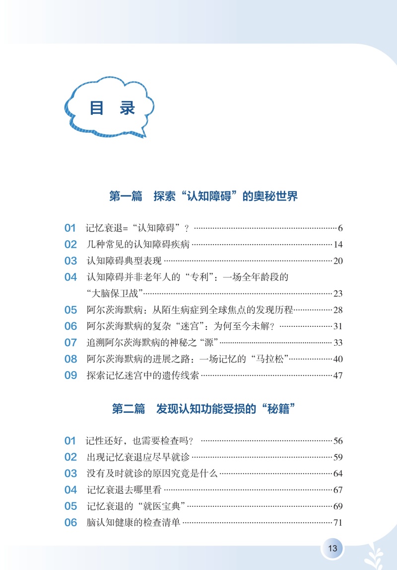 全书详细阐述认知障碍疾病预防知识,围绕认知障碍疾病评估,讲述了评估的重要性以及居家自评的方法,介绍疾病相关的可控及不可控危险因素及保护性因素,拓展预防维度,明确指出饮食、运动、睡眠、社交网络等多维度健康生活方式,以及认知刺激、认知数字疗法等认知干预在疾病预防中的重要作用,拓宽认知障碍患者预防的思路和视野,通过临床真实案例及患者照顾者的照护体验,梳理认知障碍疾病长期预防中存在的问题及解决办法。全书共六个章节,**章:揭开“认知障碍”的神秘面纱;**章 不可或缺的认知评估;第三章 远离认知障碍的风险因素;第四章 健康生活健康大脑;第五章 激发思维活力;第六章 预防永不言早。