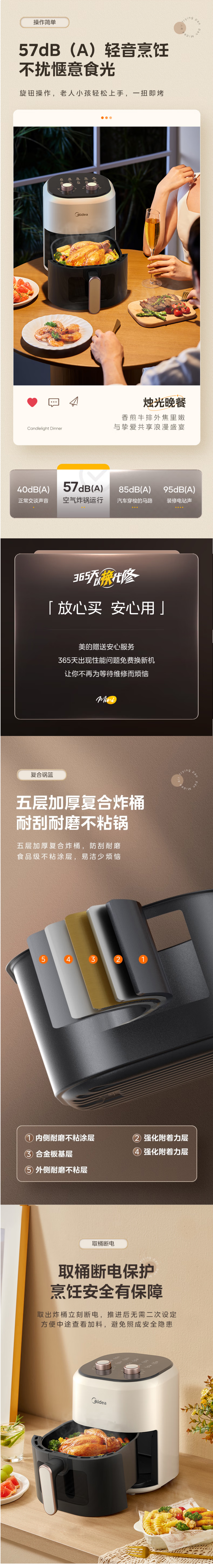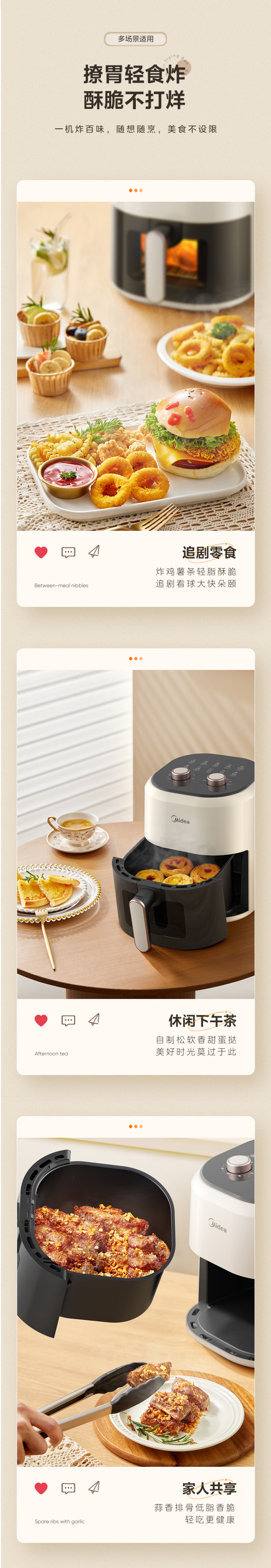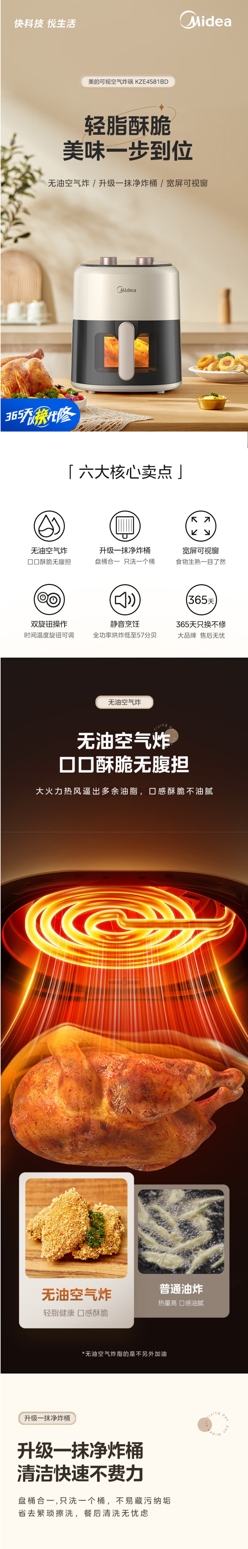 美的新款空气炸锅(510686)高清可视窗 家用大容量多用途锅 不用翻面 轻油烟不粘烤盘智能多功能一体机 【加宽把手】KZE4581BD奶油风 4.5L