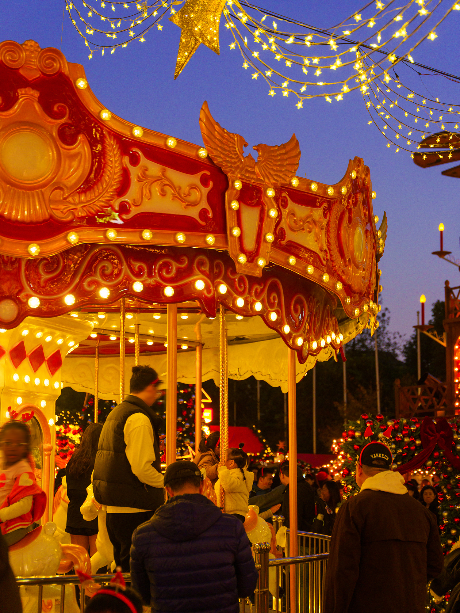 旋转木马绝对是市集的 “少女心收割机”,暖黄色灯光裹着精致的木马造型,转动时伴着清脆的音乐,瞬间把人拉回童年,骑上木马穿梭在灯光间,风里都带着浪漫的味道!