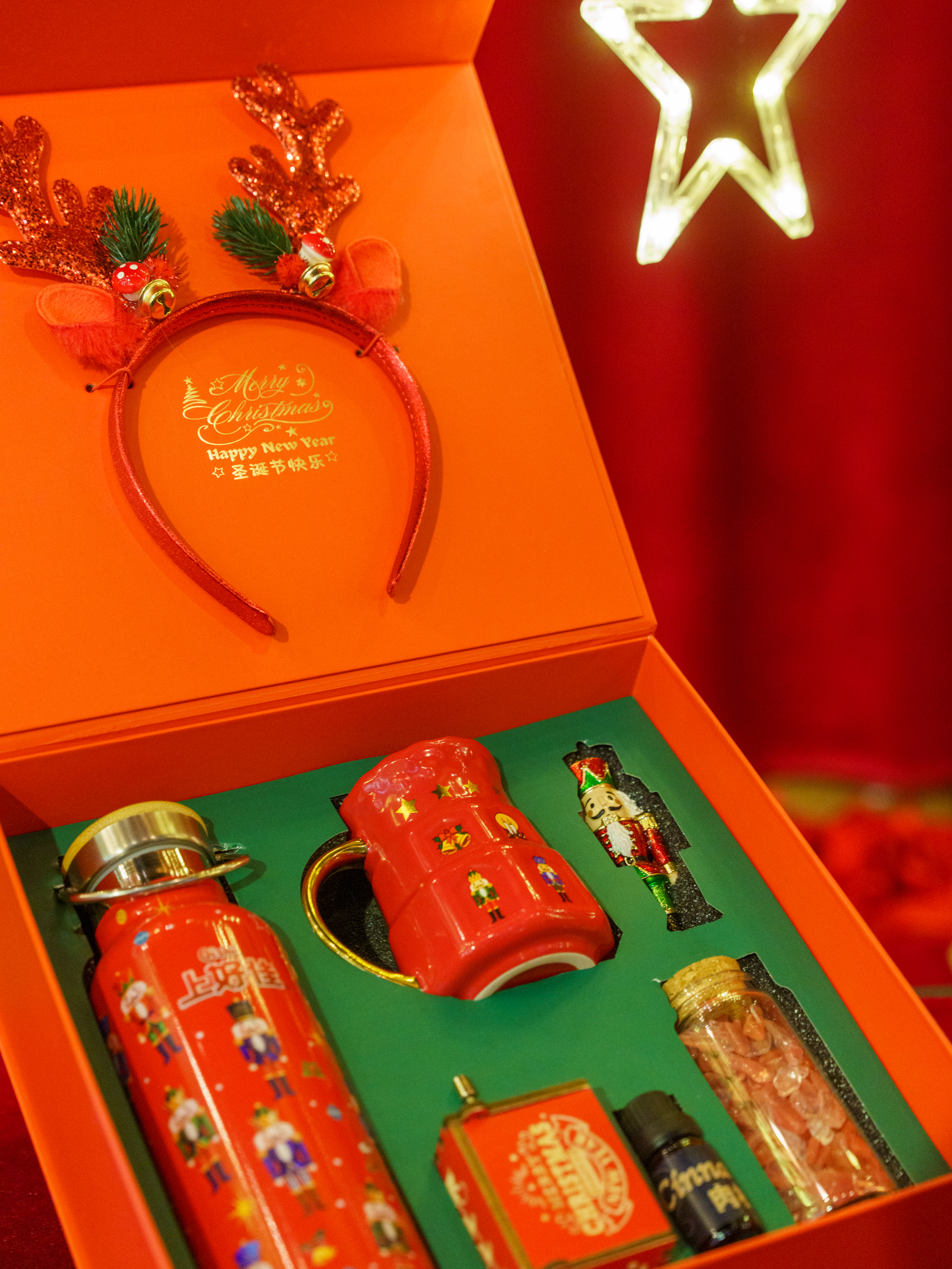 实物礼品涵盖印着热闹市集插画的圣诞马克杯、质感十足的胡桃夹子挂件、实用又好看的圣诞保温杯、能奏响经典圣诞旋律的手摇八音盒、散发着肉桂香气的扩香水晶 + 肉桂味精油,还有超精致的blingbling小鹿圣诞发箍。