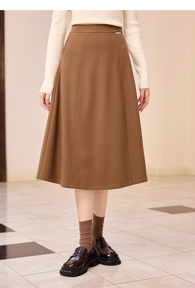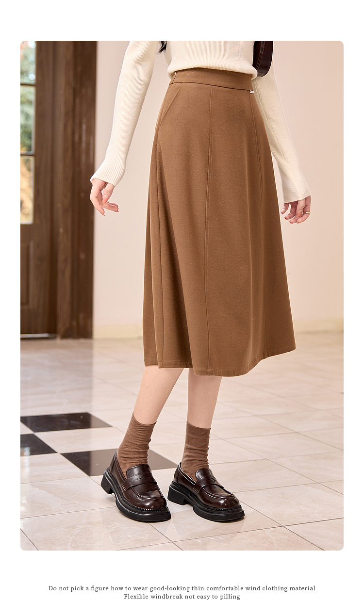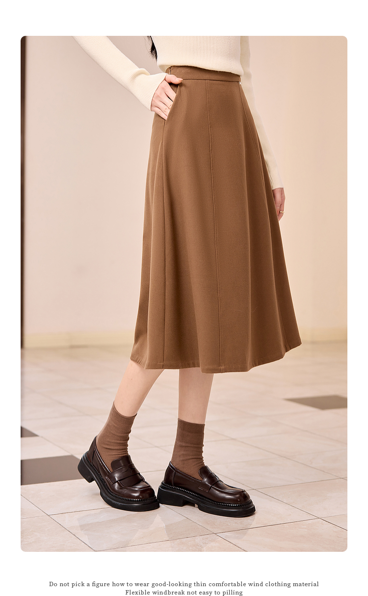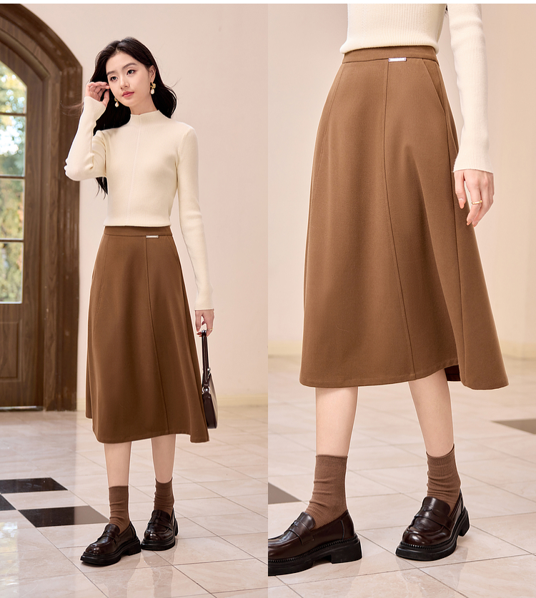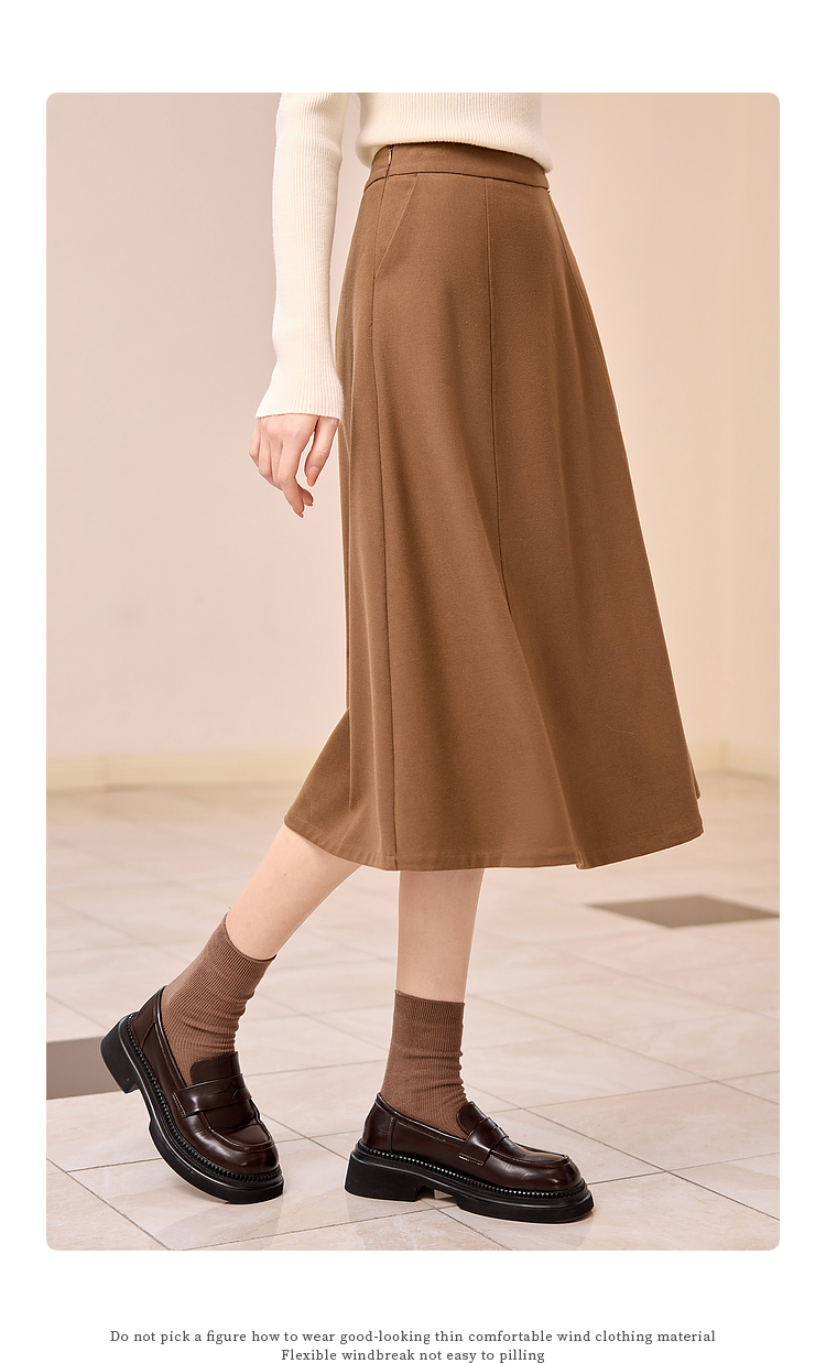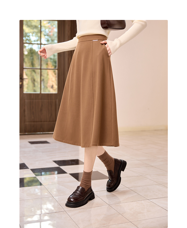 【年终特卖】熙世界赫本风棕色毛呢半身裙秋冬新款气质通勤磨毛中长a字伞裙