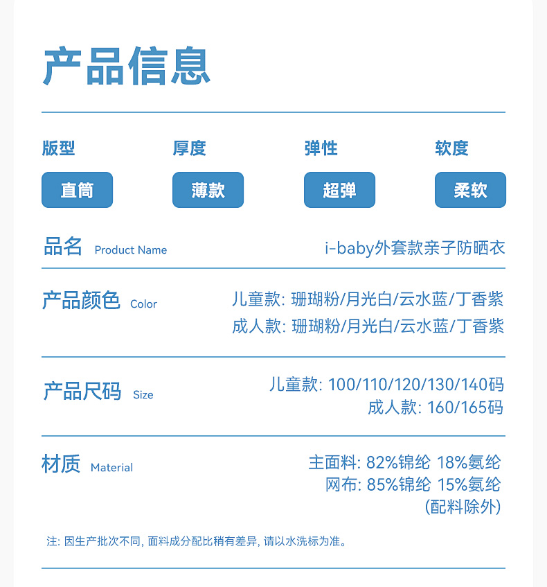 i-baby夏季清爽冰感儿童/成人中长外套款防晒衣防紫外线亲子款