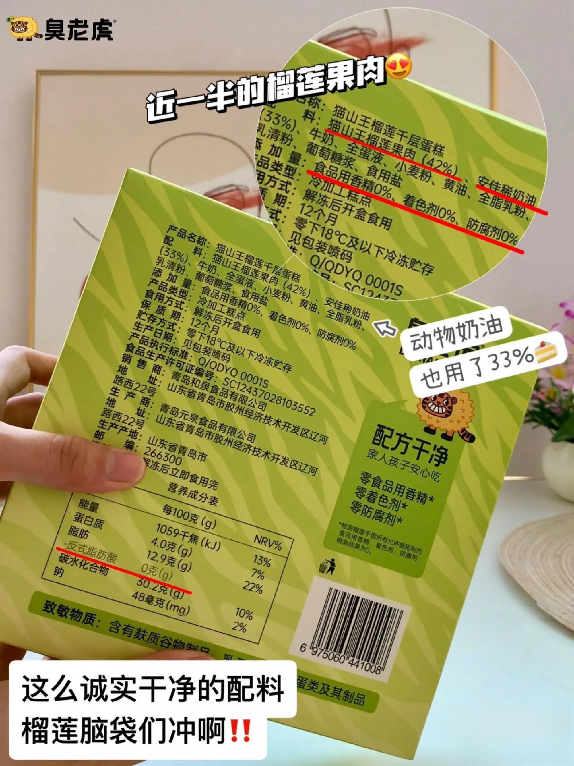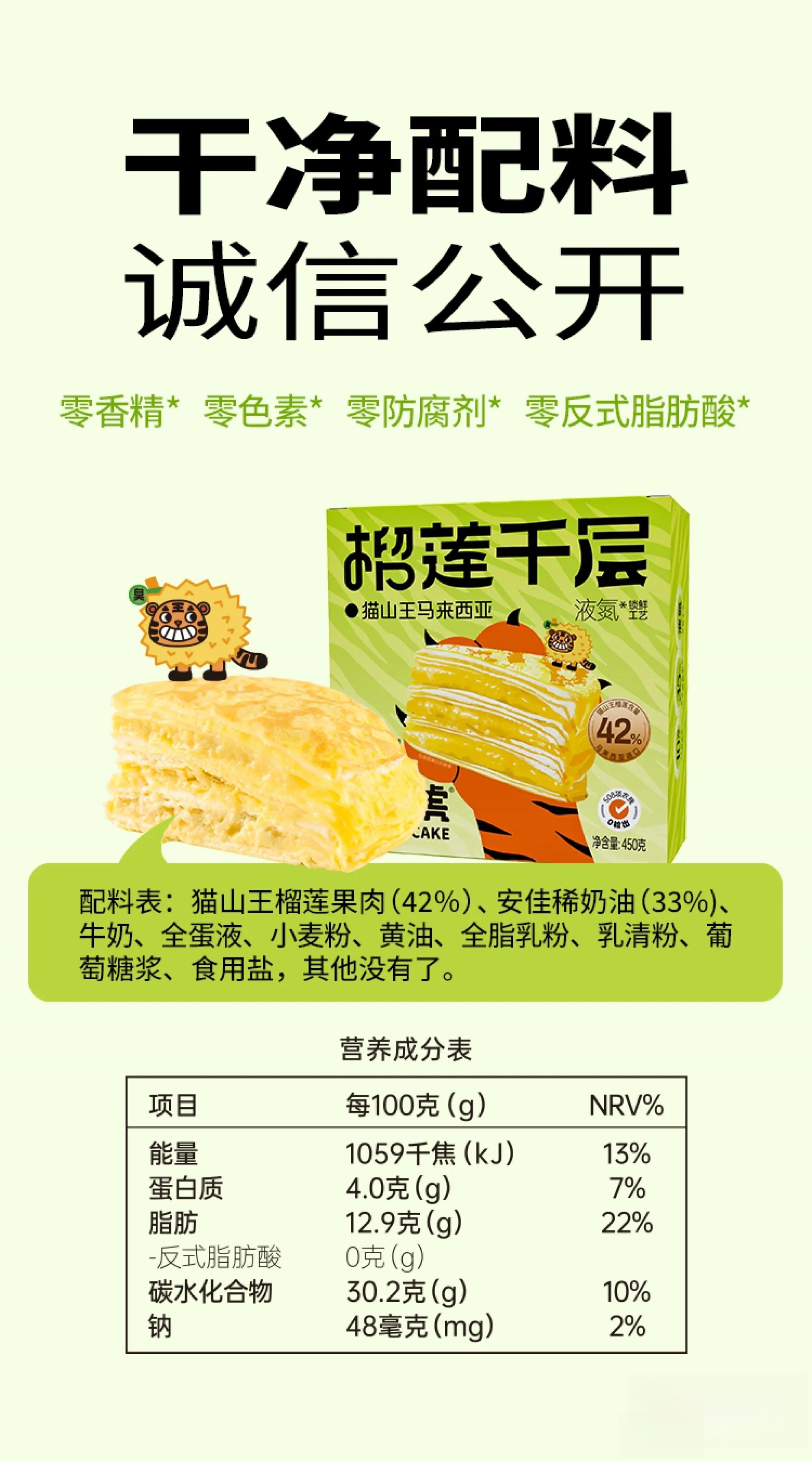 配料表仅含马来西亚猫山王榴莲肉(≥42%)、新西兰安佳动物奶油(≥33%)、牛奶、鸡蛋、小麦粉、黄油、奶粉、乳清粉、食盐、葡萄糖浆