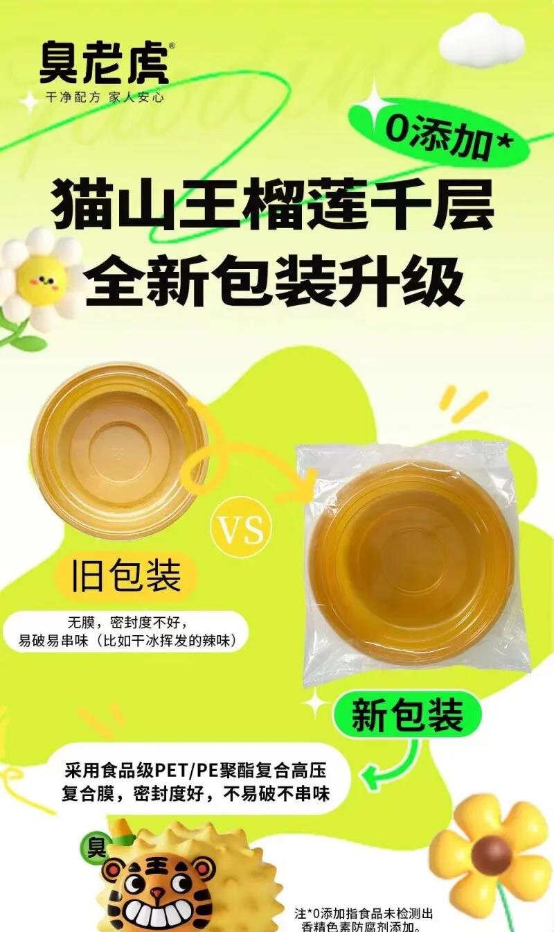 榴莲千层内包装还进行了全面升级,新增一张塑封膜,密封度更高
