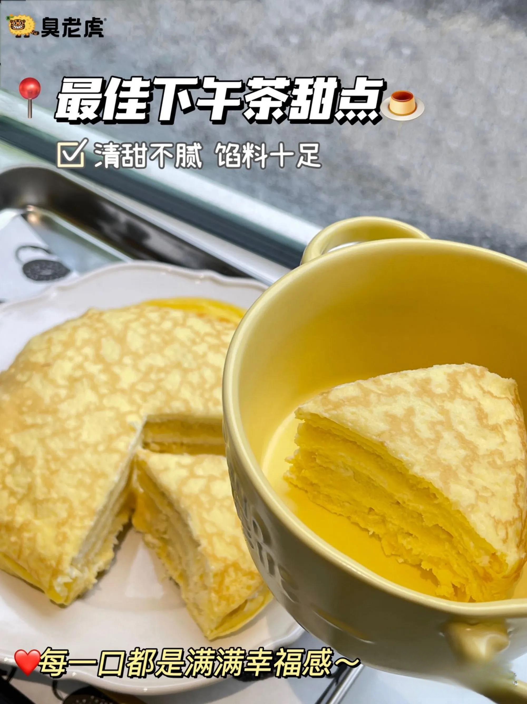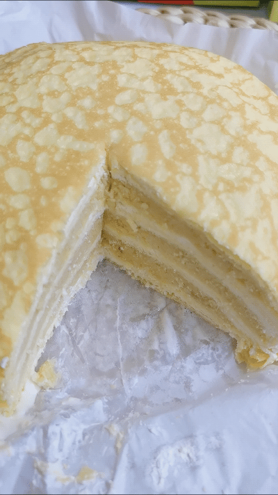 饼皮对一个千层来说也很重要,这款虎纹蛋皮前后经过20多次优化改良,最后做出来的饼皮薄至0.1cm,每张皮还不到10g,是用荷兰进口纯牛奶🥛和正大的消毒鸡蛋液手工和面,不加一滴水,不用蛋糕粉。用料很实在,吃得放心