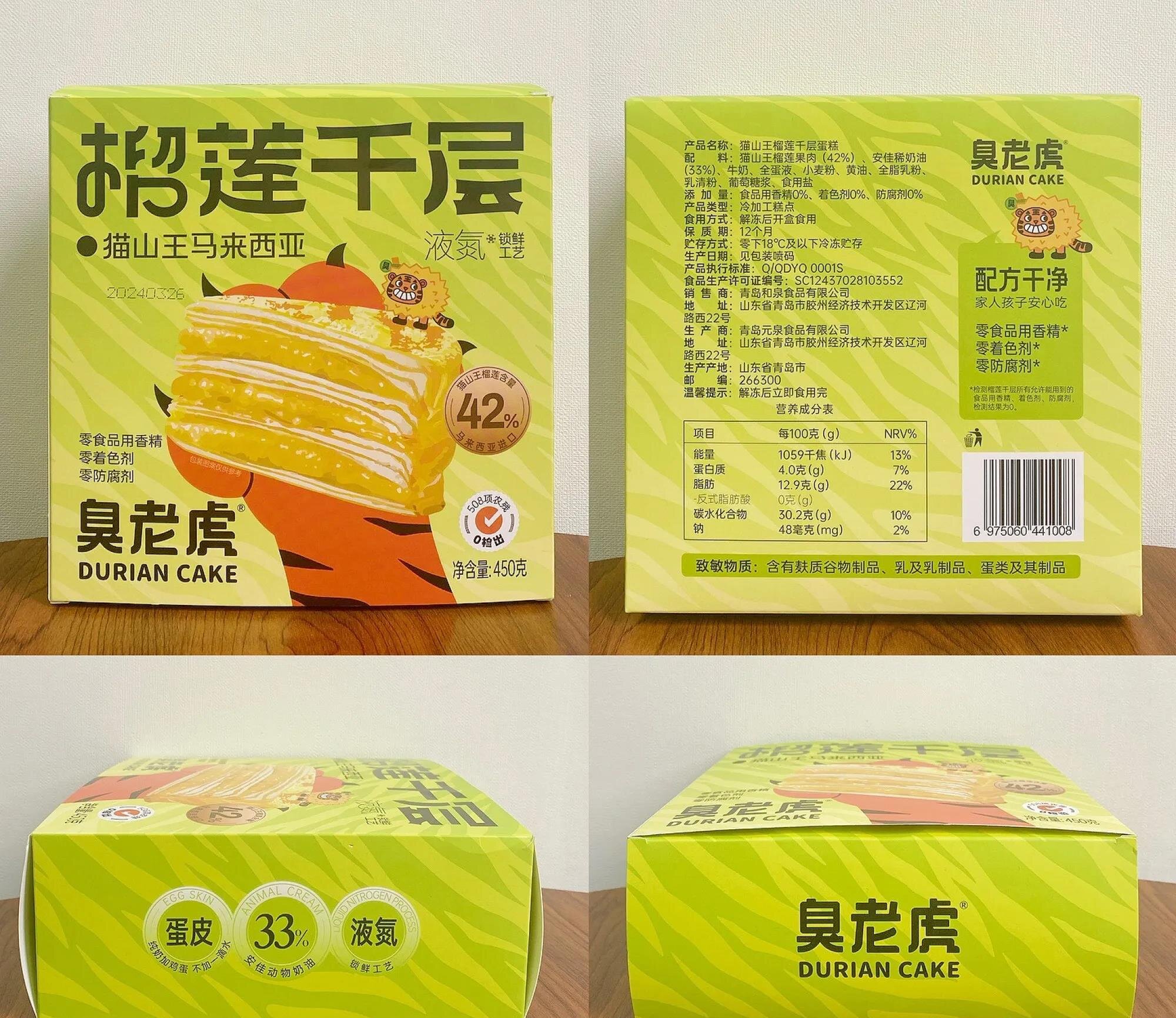 我们这款榴莲千层采用食品级PET抗压盒子,拥有国内外食品安全双认证,放心吃!