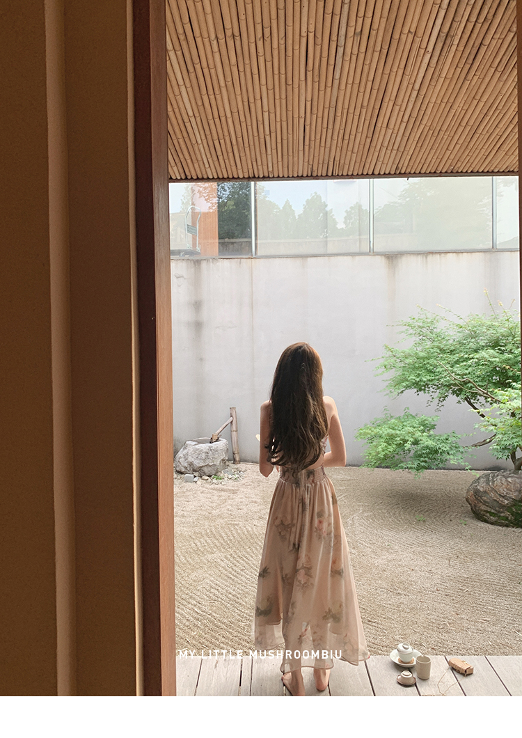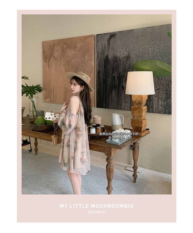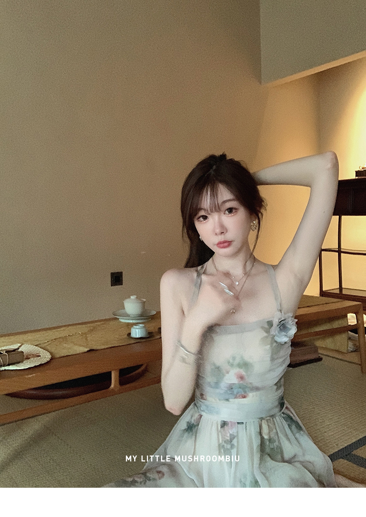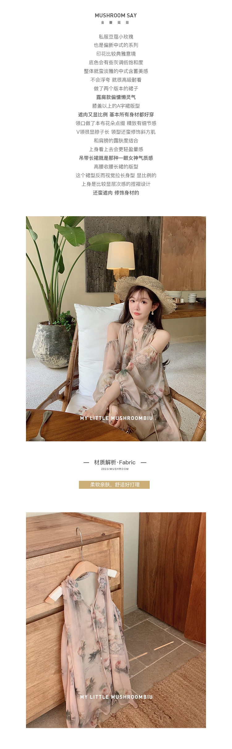 M码 金蘑菇菇 豆蔻小玫瑰 / 新中式露肩挂脖连衣裙碎花吊带裙
