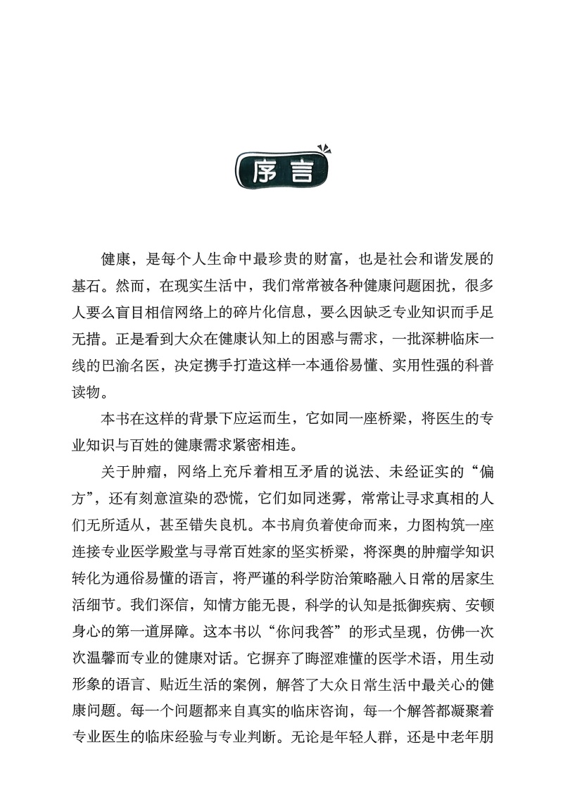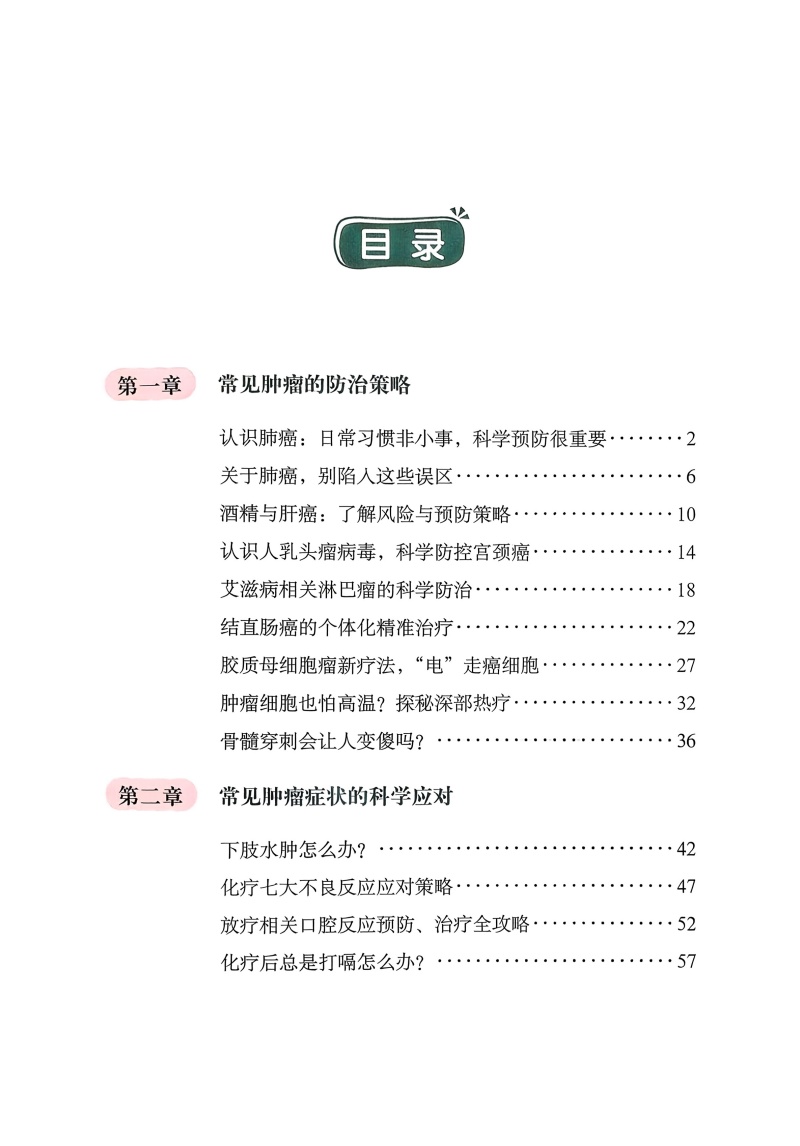 第一部分为常见肿瘤的预防管理策略,介绍了常见肿瘤的风险因素、诊断治疗及相关并发症的应对、康复指导的全周期管理,并就日常生活中的误区进行厘清。