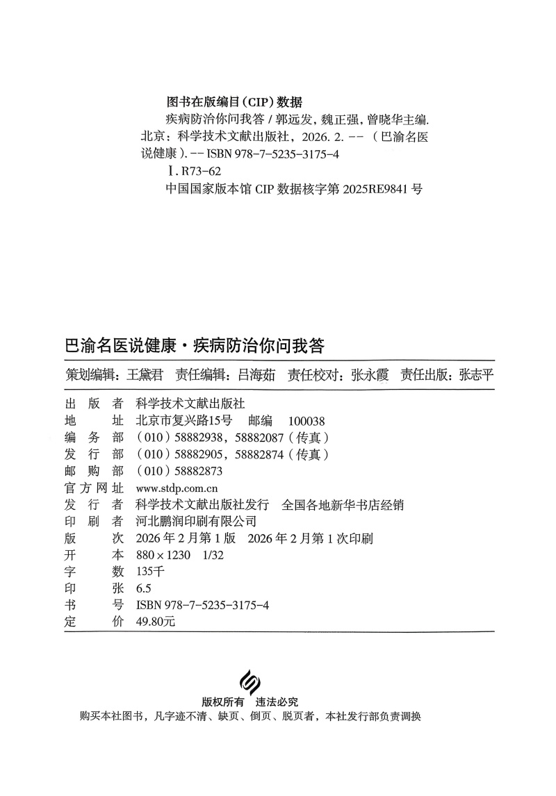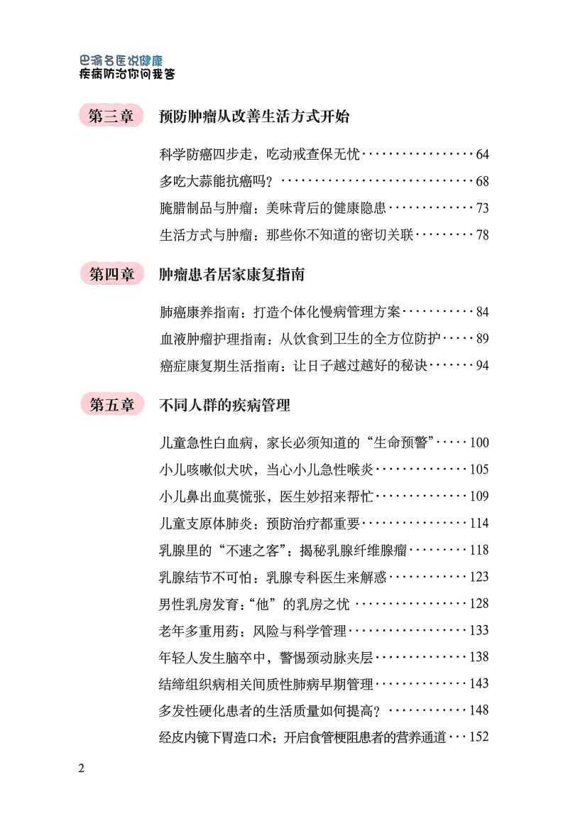 第二部分为特殊人群疾病管理指导,介绍了妇儿、老年人相关疾病以及常见慢病的科学认识、应对与管理。