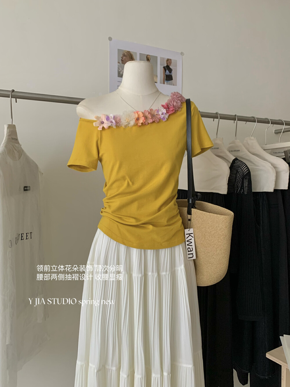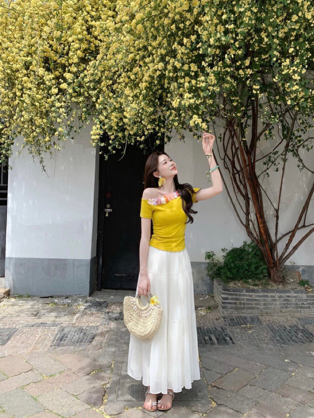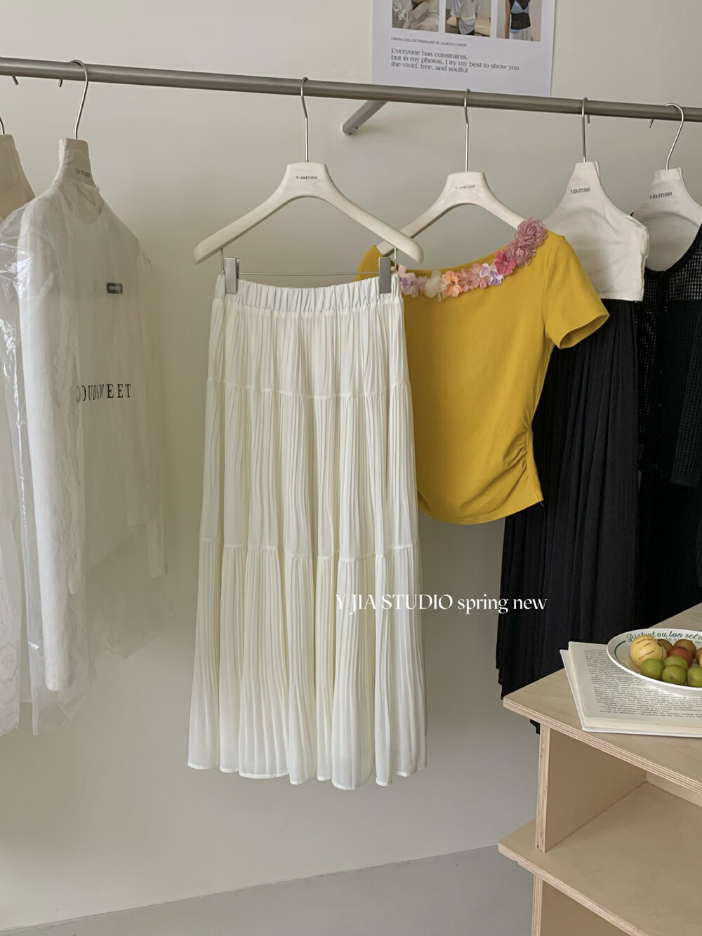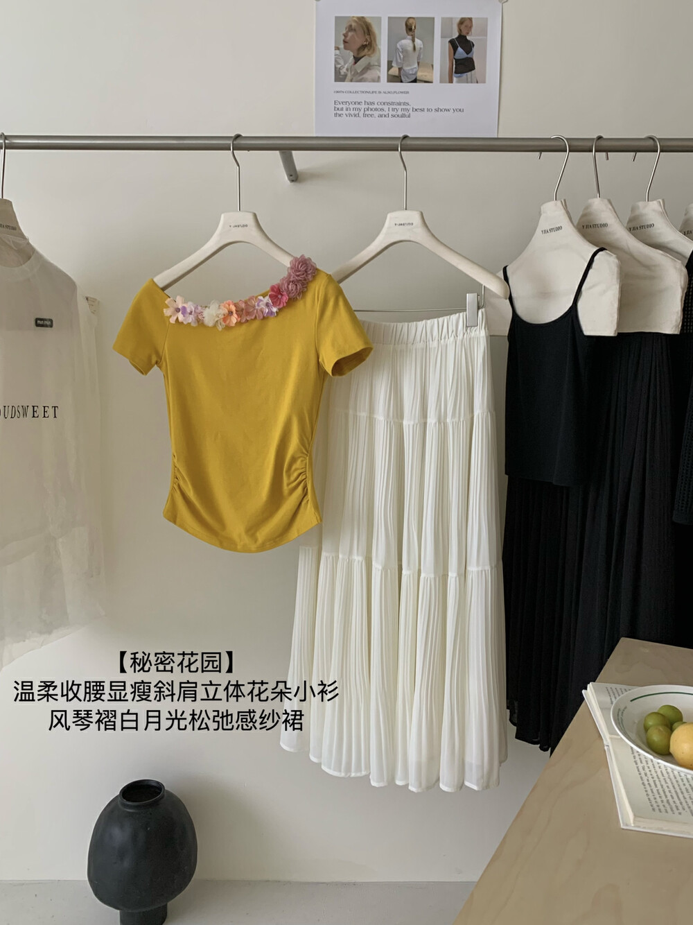 【GZ】无忧购【秘密花园】温柔收腰显瘦斜肩立体花朵小衫+风琴褶白月光纱裙套装9121-5(截单后3-5天发货)