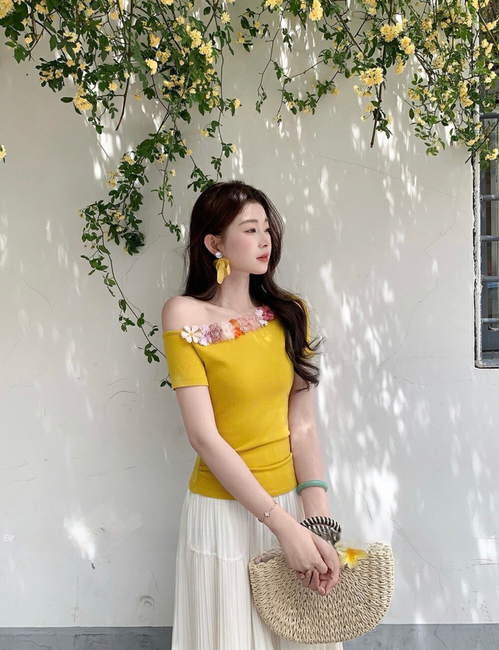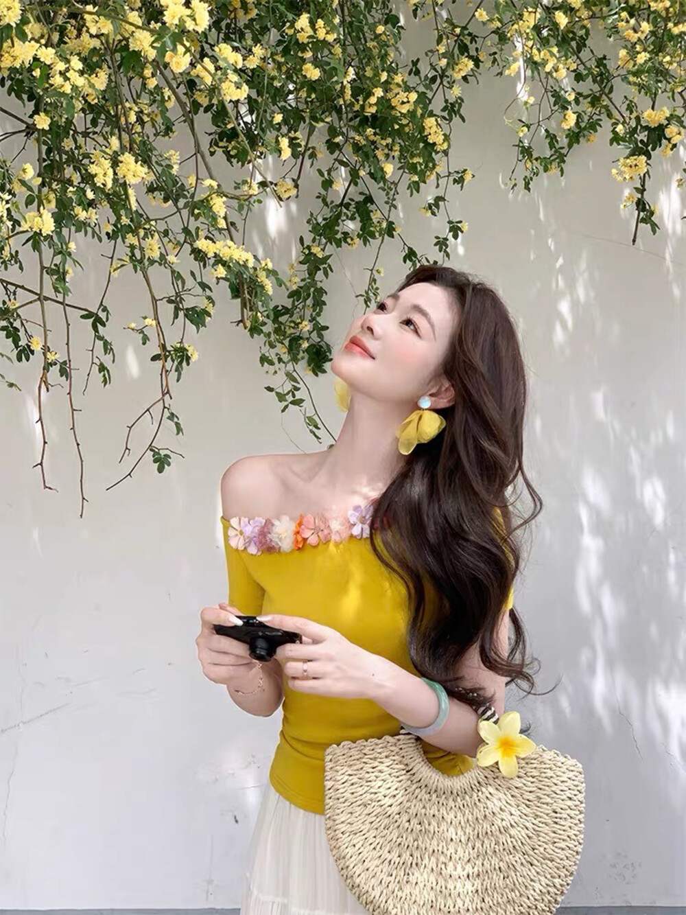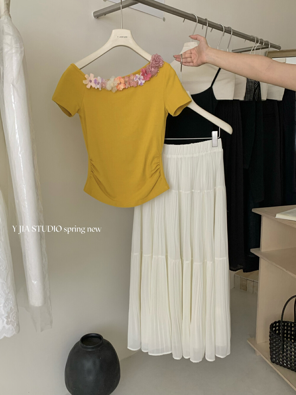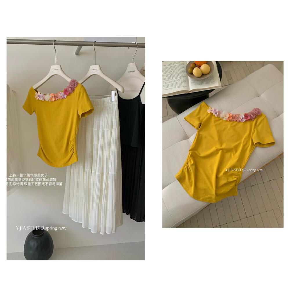 【GZ】无忧购【秘密花园】温柔收腰显瘦斜肩立体花朵小衫+风琴褶白月光纱裙套装9121-5(截单后3-5天发货)