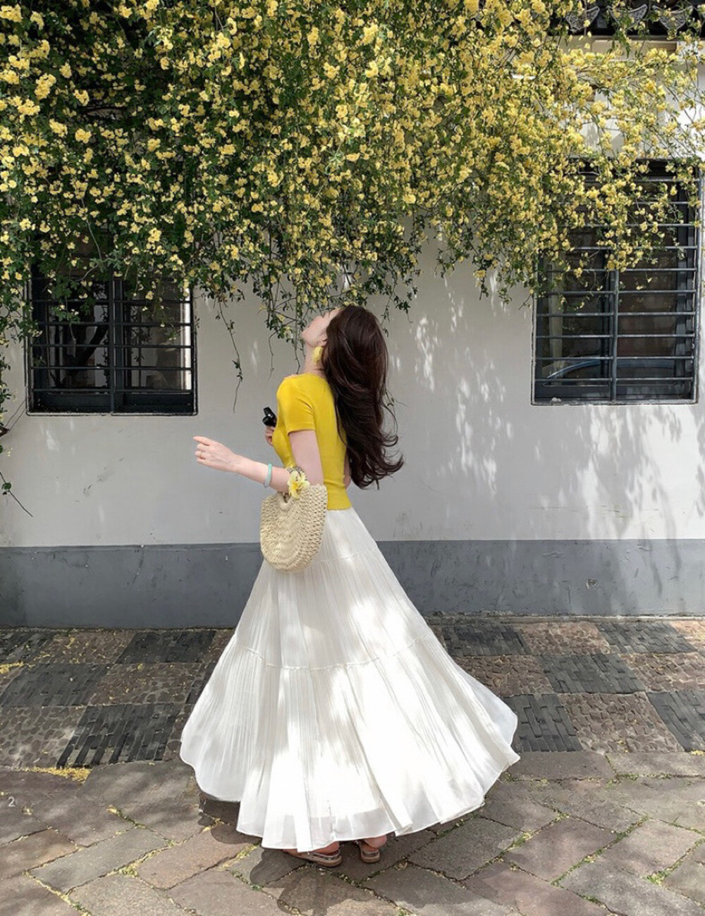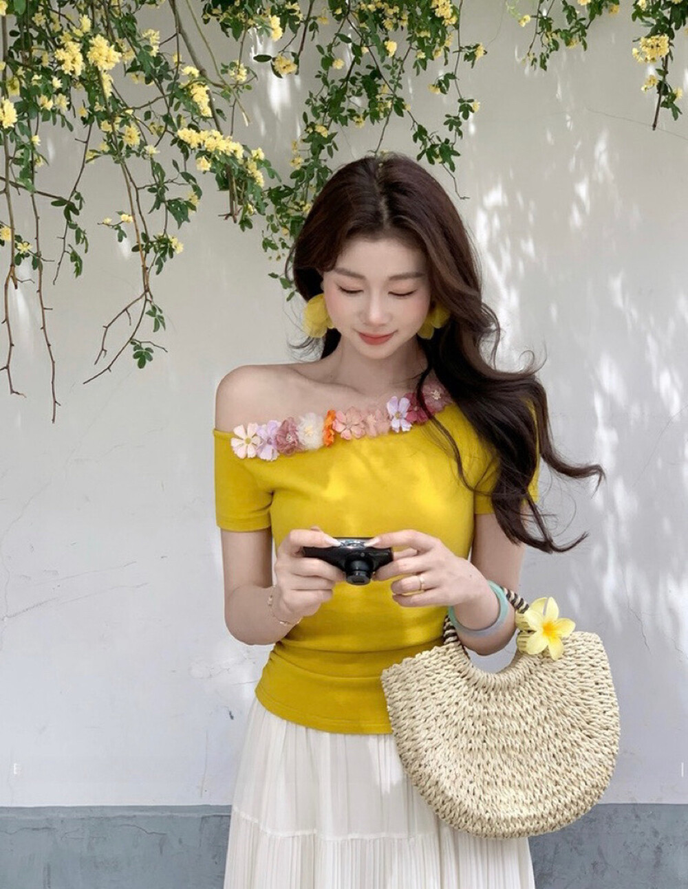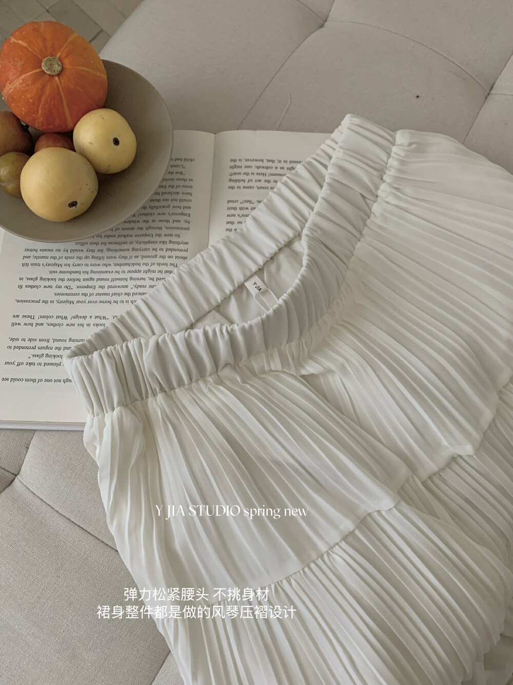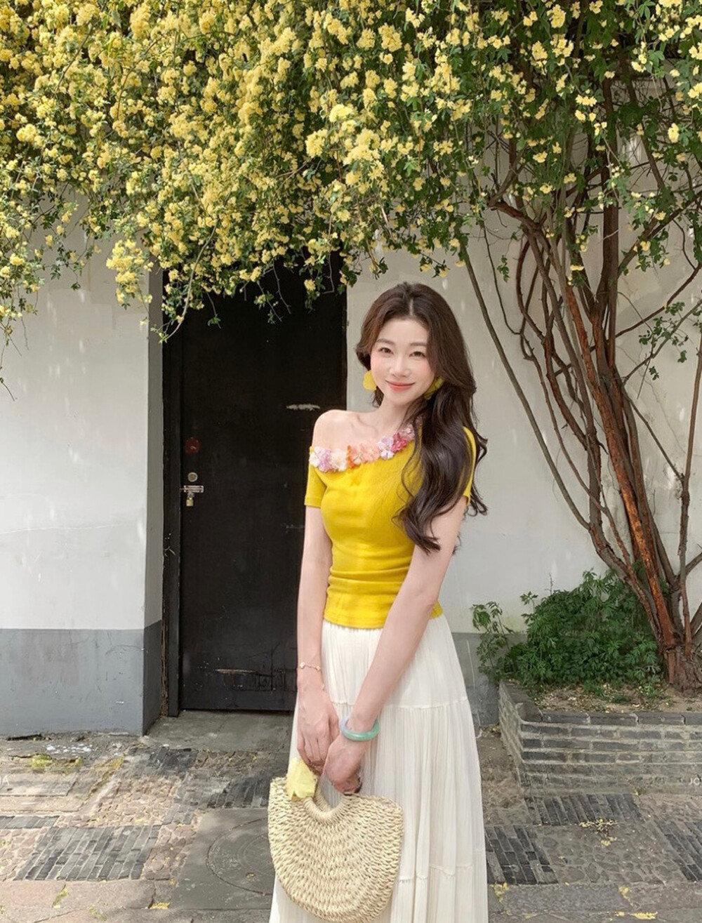 【GZ】无忧购【秘密花园】温柔收腰显瘦斜肩立体花朵小衫+风琴褶白月光纱裙套装9121-5(截单后3-5天发货)