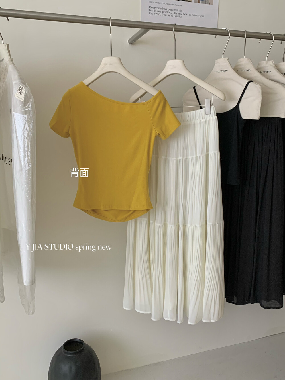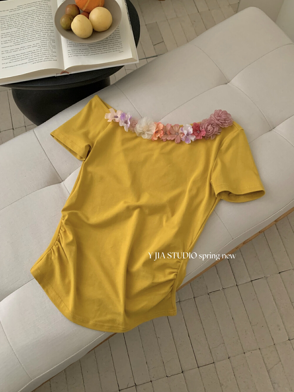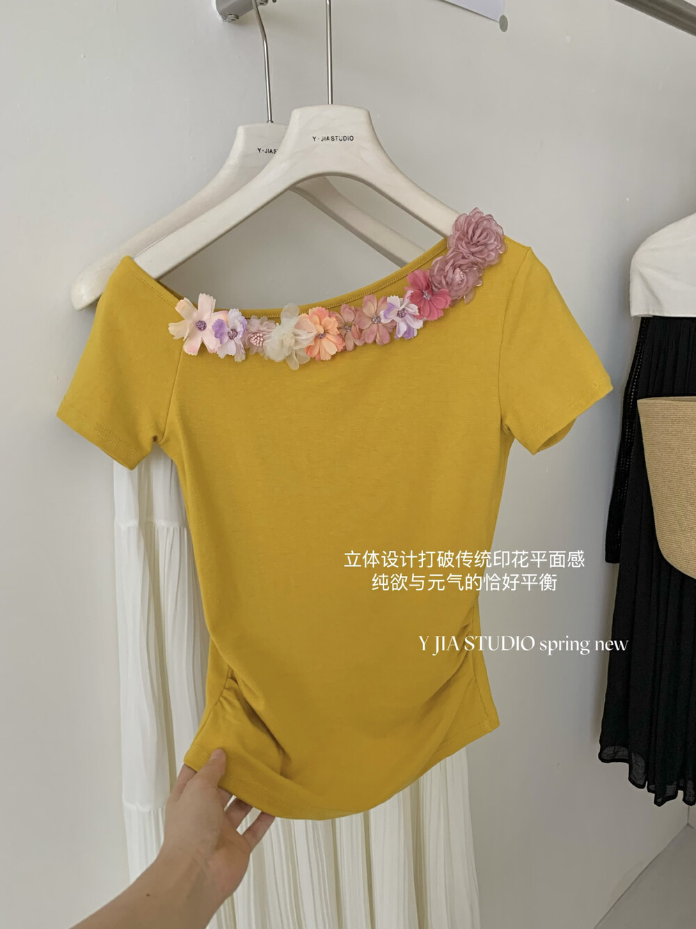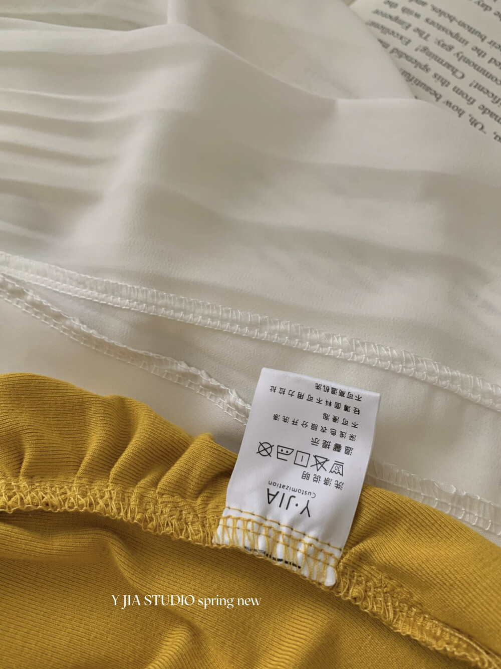 【GZ】无忧购【秘密花园】温柔收腰显瘦斜肩立体花朵小衫+风琴褶白月光纱裙套装9121-5(截单后3-5天发货)