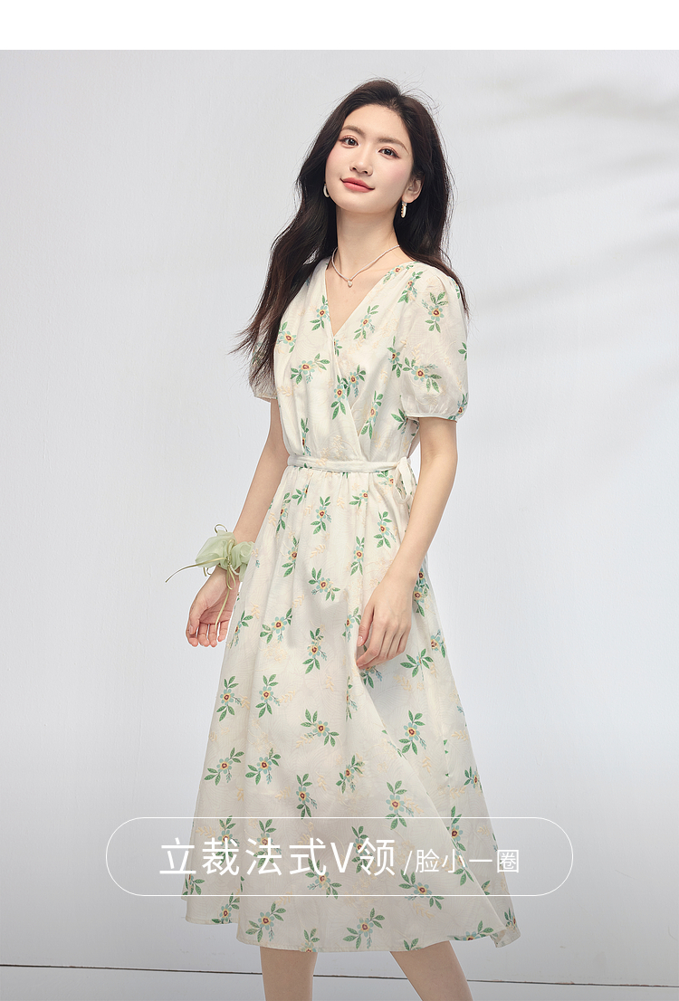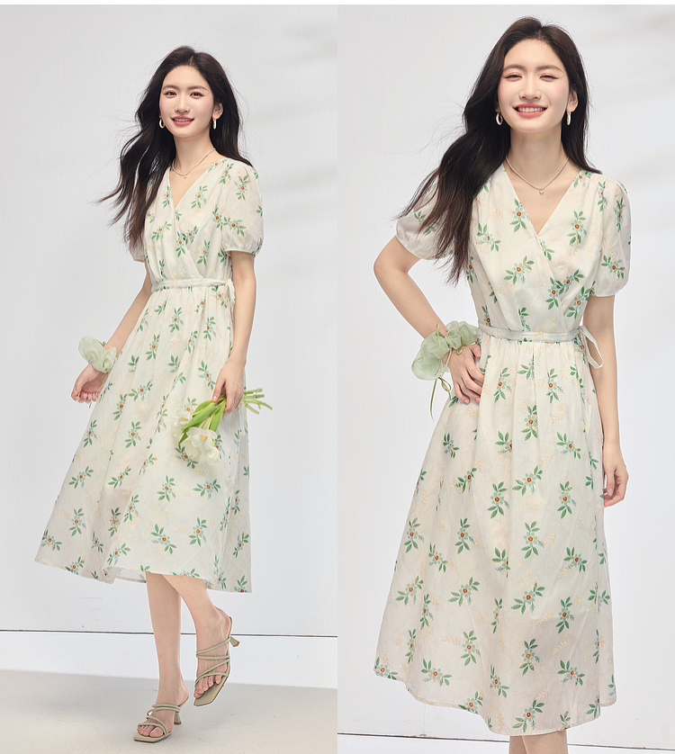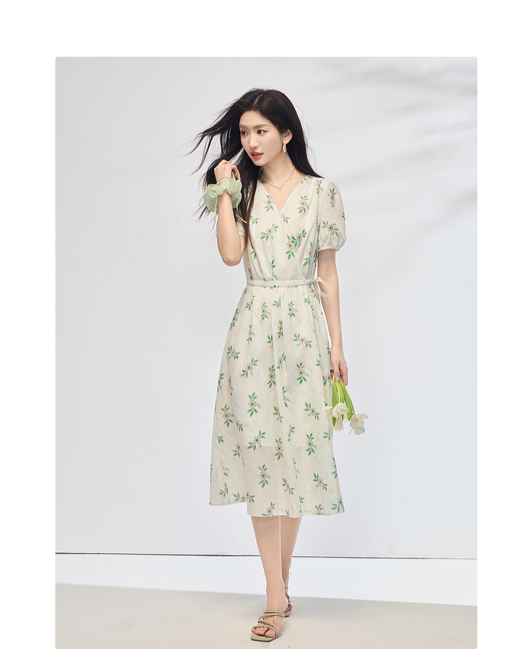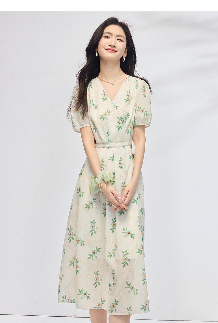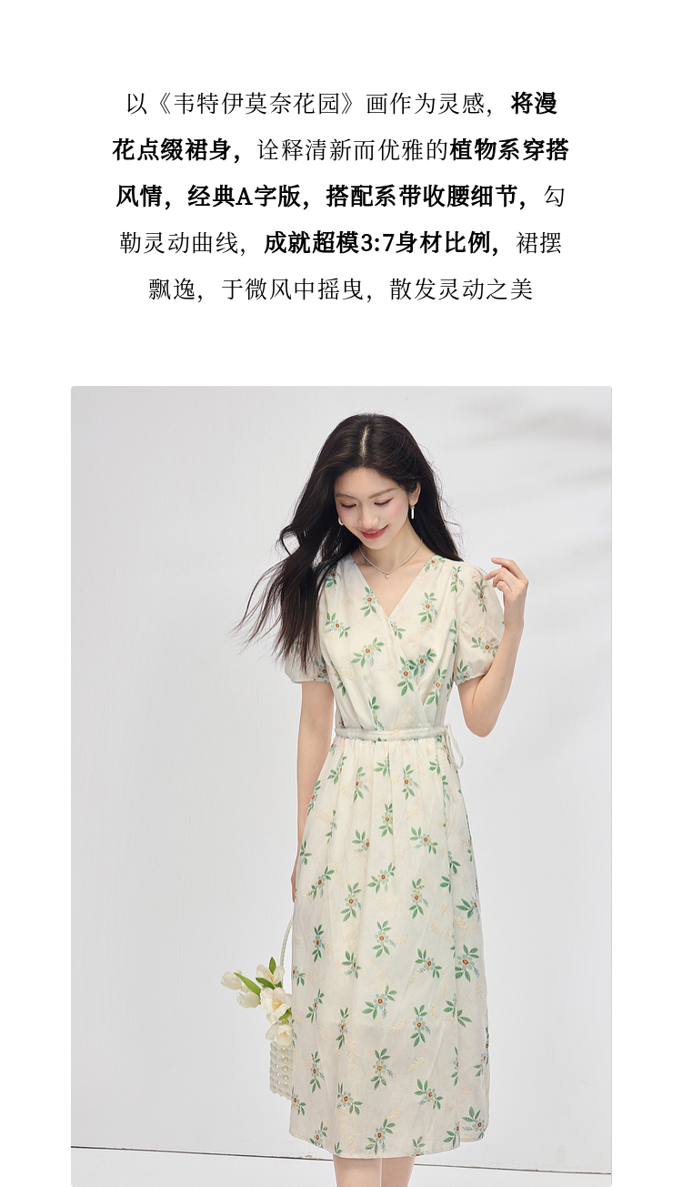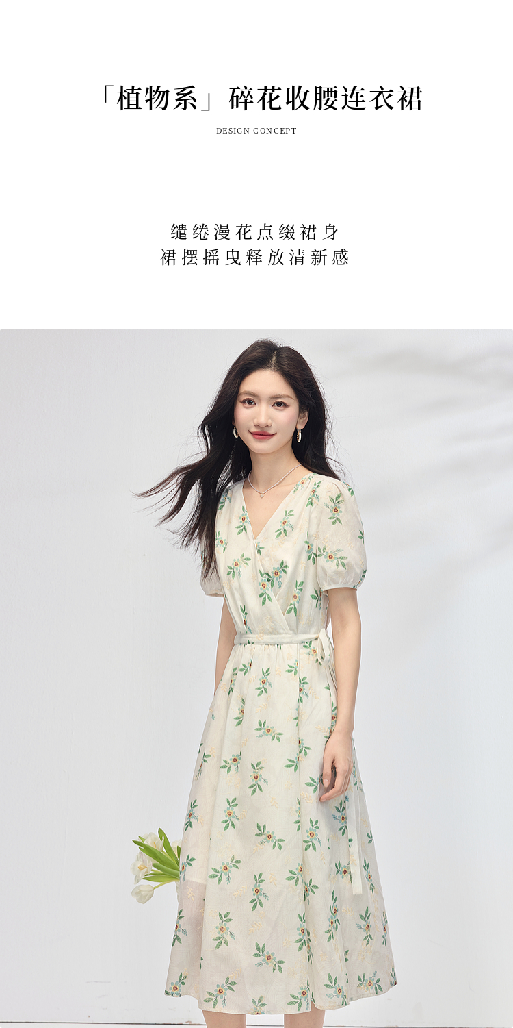 【专属特价】熙世界【植物系碎花】收腰显瘦V领连衣裙女夏季温柔风泡泡袖裙子