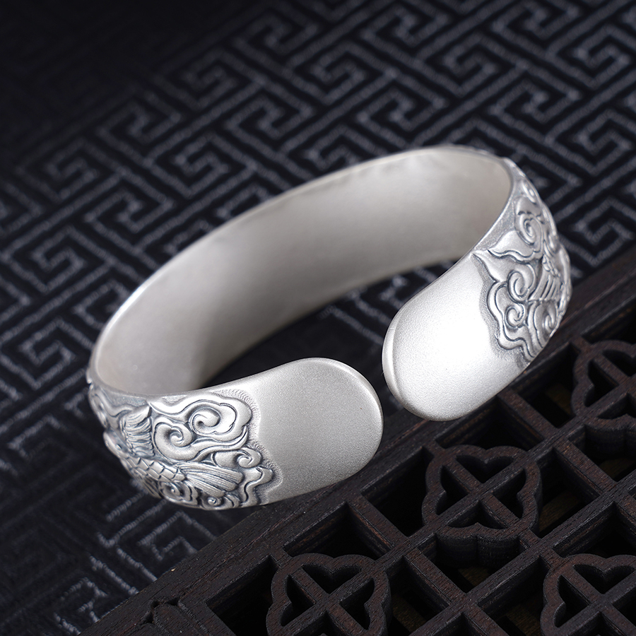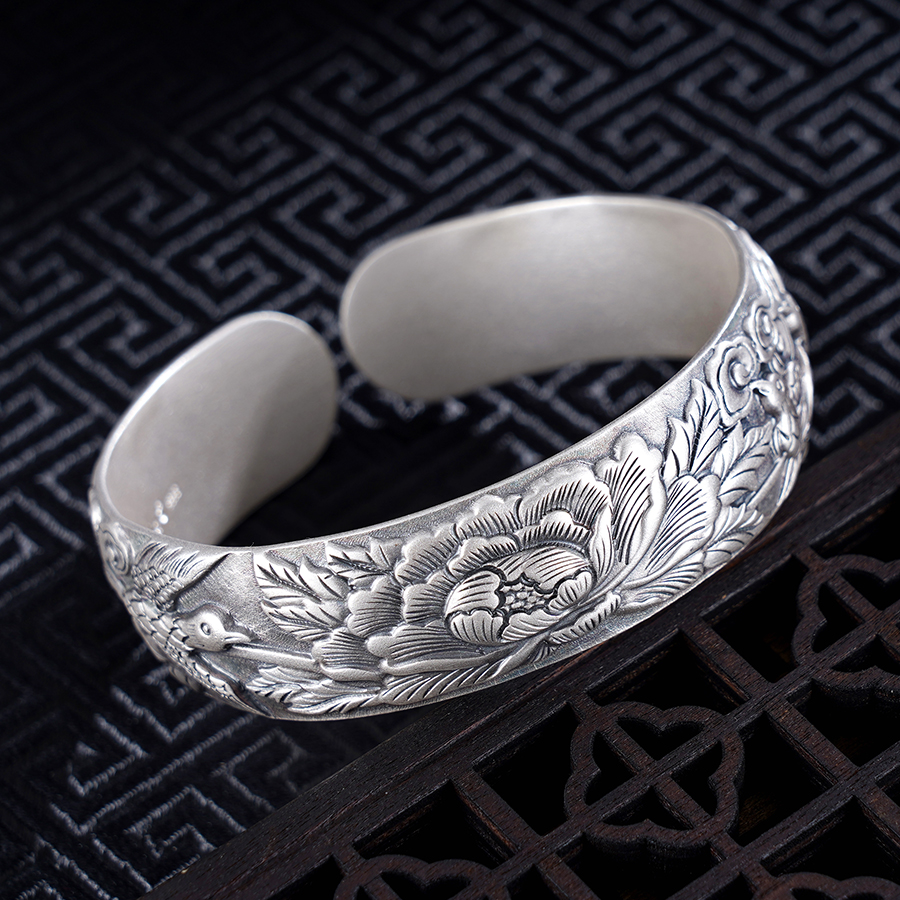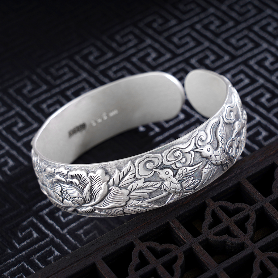 【寓意】:在錾刻工艺的雕琢下,凤凰与牡丹巧妙融合,呈现出梦幻联动。凤凰展翅穿花,熠熠生辉,承载着无限吉祥与美好祝愿。