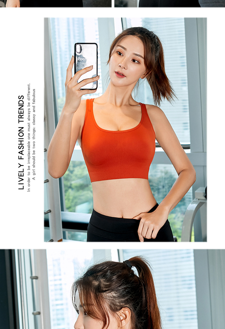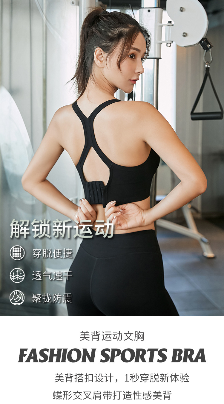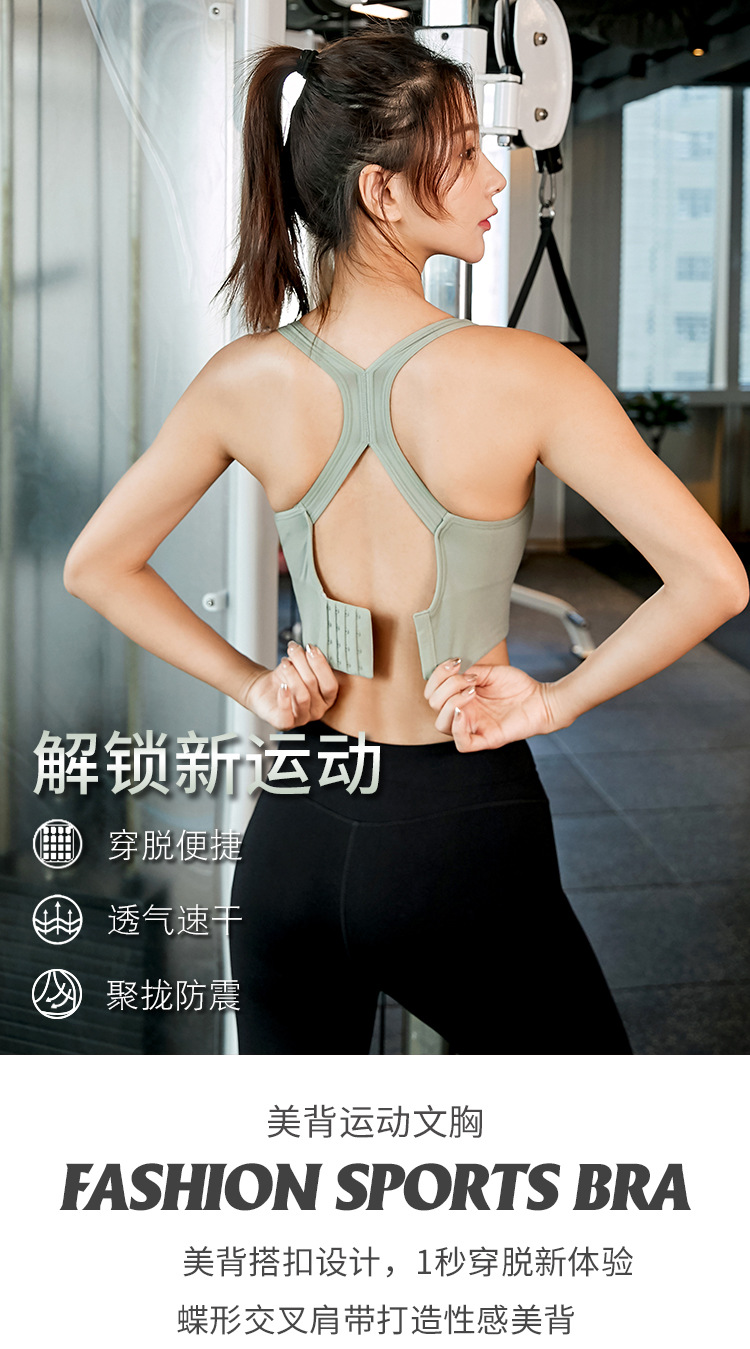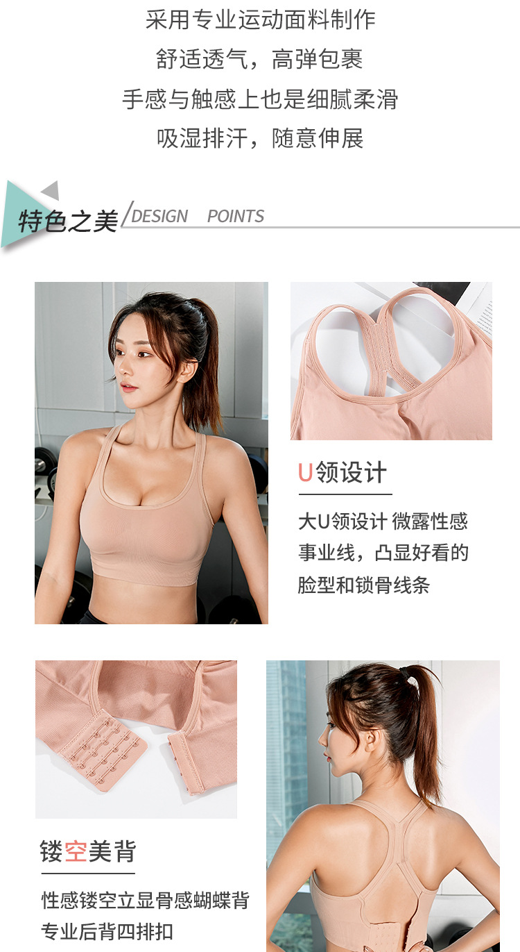 【特色】本款设计后4排扣可调节增强内家的固定性,背心式扇形镂空防震运动内衣,彩用高弹面料,吸湿排汗透气,健身运动内衣