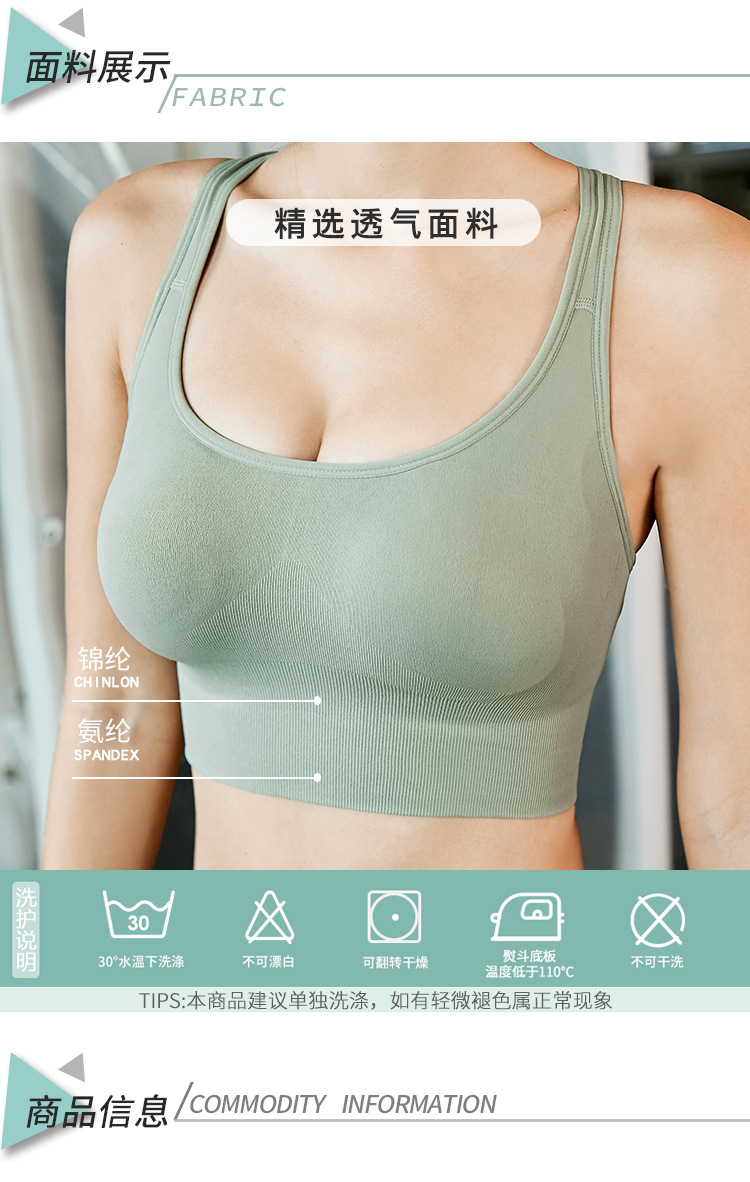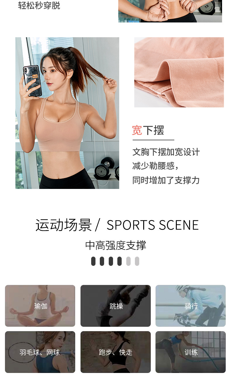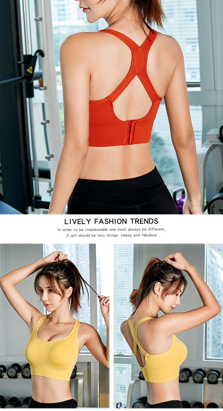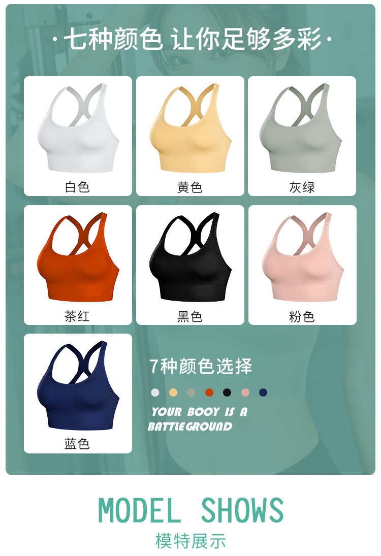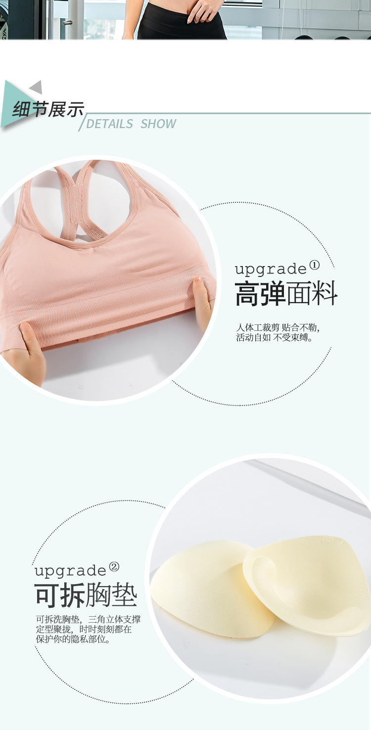 【特色】本款设计后4排扣可调节增强内家的固定性,背心式扇形镂空防震运动内衣,彩用高弹面料,吸湿排汗透气,健身运动内衣