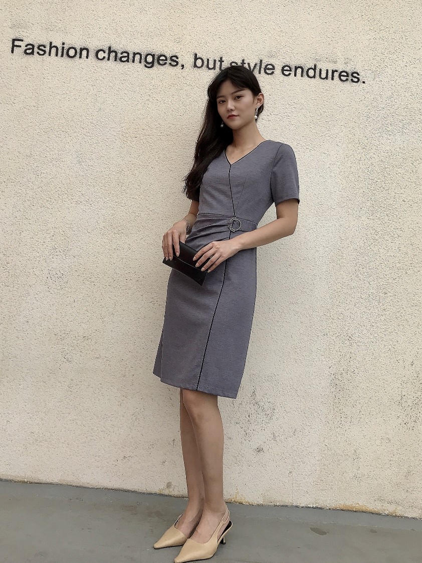 60020# 短袖连衣裙自带高级感的一条裙子,垂坠顺滑的面料质感好又有挺阔感,再用明线迹装饰,腰间金属扣细节上颇具小心机但又不会凌乱复杂。平时简单套一件出门也能够气场全开