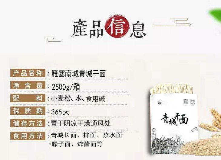 “跟晚报GO”商城这款青城干面以大西北高原高筋骨小麦粉为原料,采用当地传统工艺制作,人工晾晒,7-15天自然阴干,不见风、不见阳、不受烘,不添加任何防腐剂和化学添加剂,独立包装,方便快捷,做到原料、生产、晾晒、包装、检测等工序的安全把控。