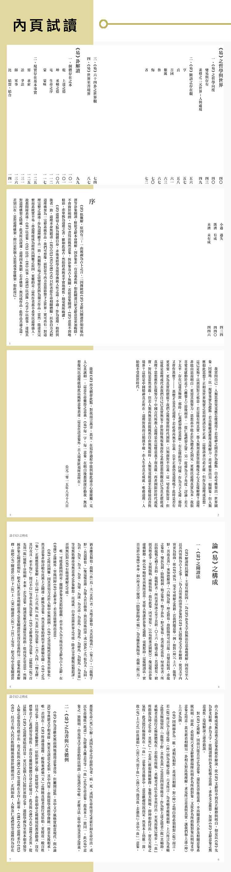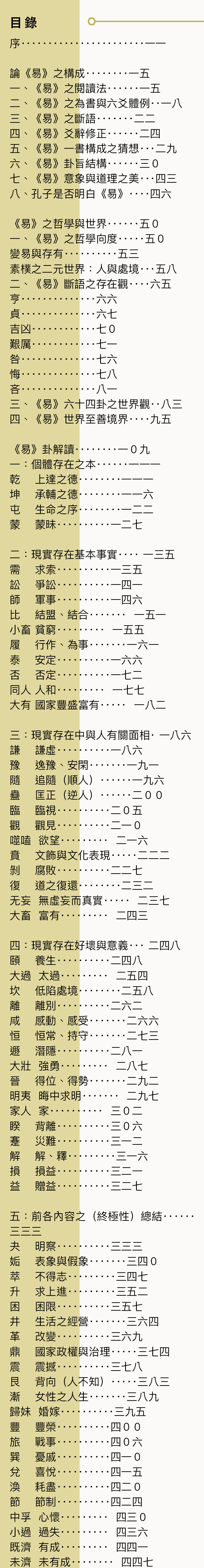 本書分為兩部分。第一部分總論《易經》的構成,與其中蘊含的哲學觀點。第二部分按個體存在之本、現實存在基本事實、現實存在中與人有關面相、現實存在好壞與意義、以上內容之終極性總結五個層次劃分六十四卦並逐個解讀。