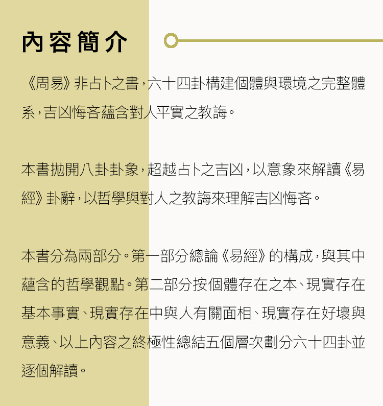 本書拋開八卦卦象,超越占*之吉凶,以意象來解讀《易經》卦辭,以哲學與對人之教誨來理解吉凶悔吝。