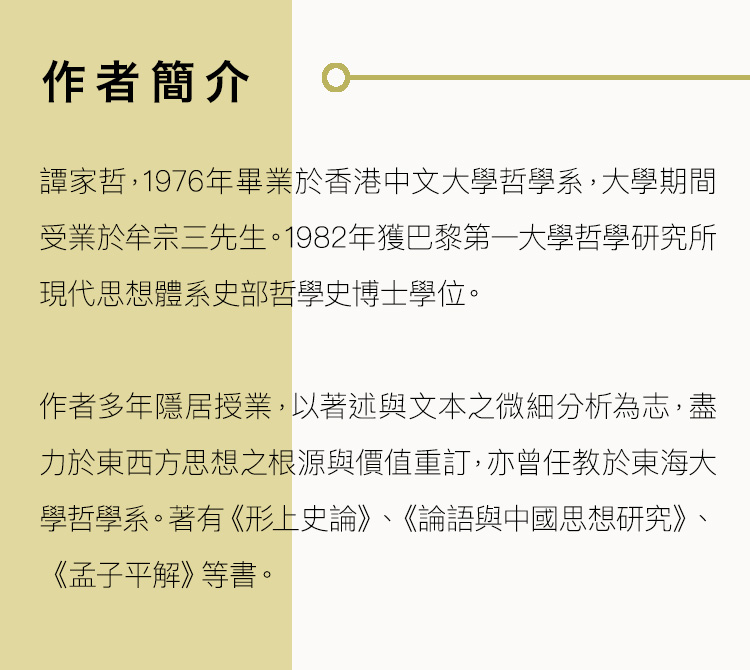 1976年畢業於香港中文大學哲學系。1982年獲巴黎第一大學哲學研究所現代思想體系史部哲學史博士學位。作者多年隱居授業,以著述與文本之微細分析為志,盡力於東西方思想之根源與價值重訂,亦曾任教於東海大學哲學系。著有《形上史論》、《論語與中國思想研究》、《孟子平解》等書。
