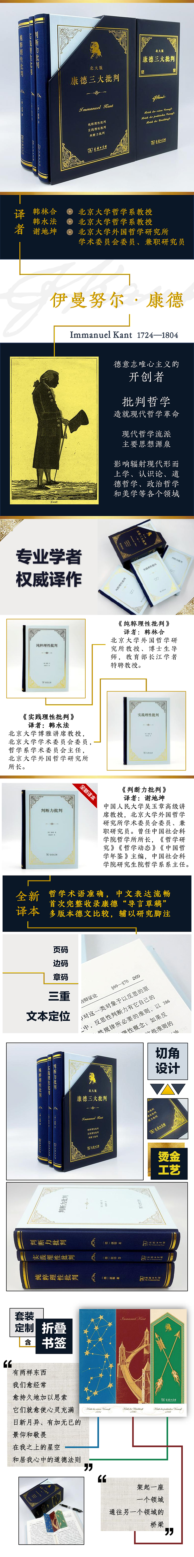 “北大版康德三大批判”是商务印书馆最新推出的学术译作成果套装,包含德国著名哲学家伊曼努尔・康德最重要的三部哲学著作:《纯粹理性批判》(1781)、《实践理性批判》(1788)、《判断力批判》(1790)。伊曼努尔・康德作为启蒙运动时期的重要代表人物,在世界哲学史上占据举足轻重的地位,其思想对后世哲学发展产生了广泛而深远的影响。三大批判著作的问世,标志着批判哲学体系的正式确立,不仅革新了传统哲学研究范式,更为西方哲学发展开辟了全新方向,在哲学理论建构与方法论层面均具有里程碑意义。