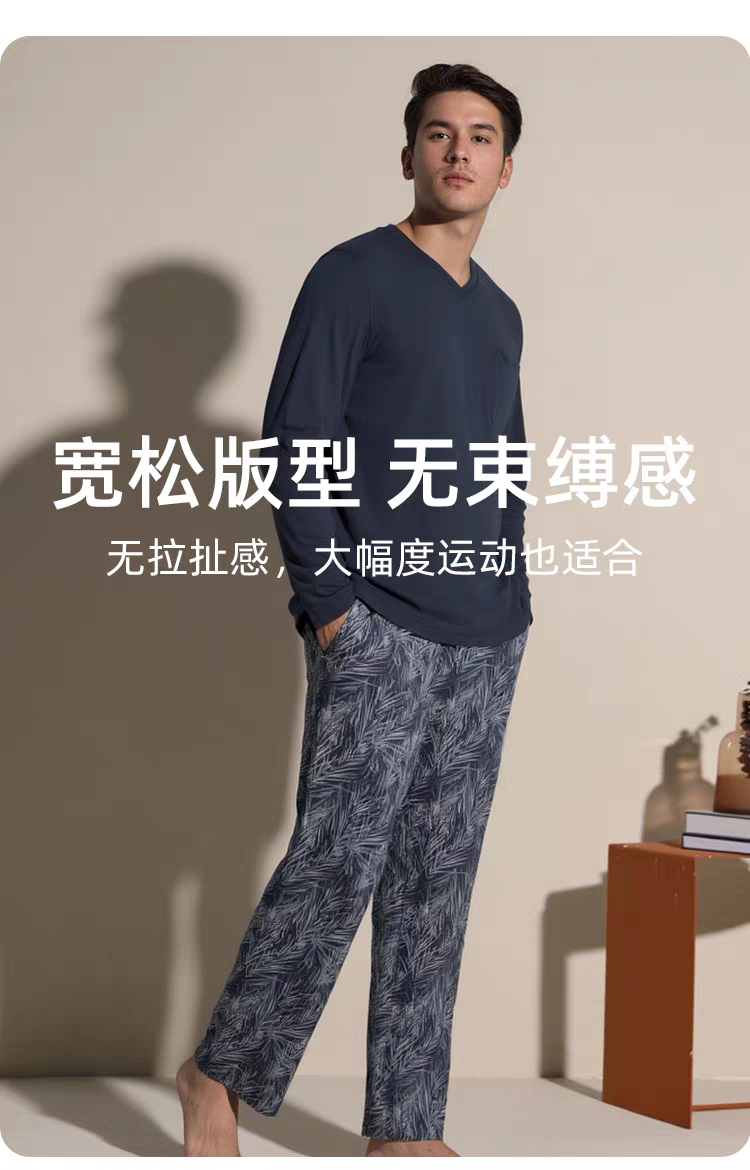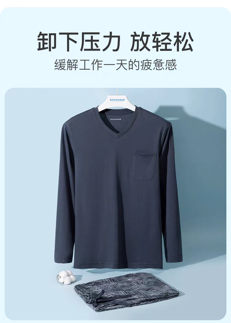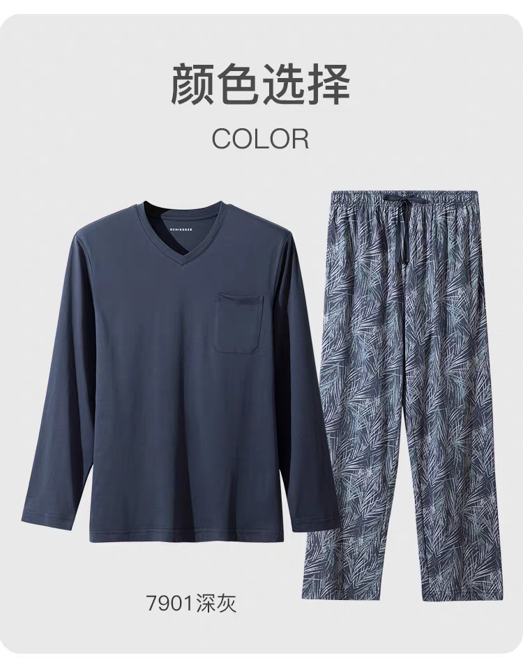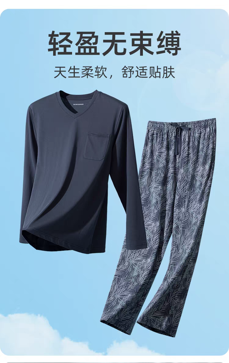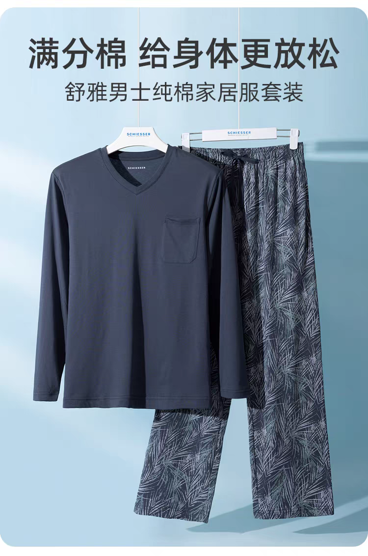 【100%棉]德国舒雅纯棉男士睡衣25年秋季新款V领长袖宽松家居服套装39/25487H
