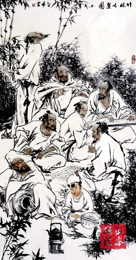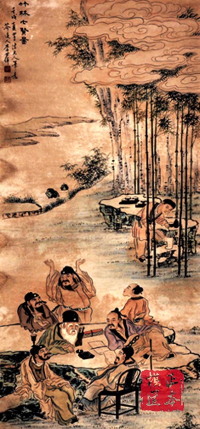 三国时期曹魏正始年间(240-249),嵇康、阮籍、山涛、向秀、刘伶、王戎及阮咸七人,常在当时的山阳县(今河南辉县、修武一带)竹林之下,喝酒、下棋,弹琴,纵歌,肆意酣畅,世谓竹林七贤。