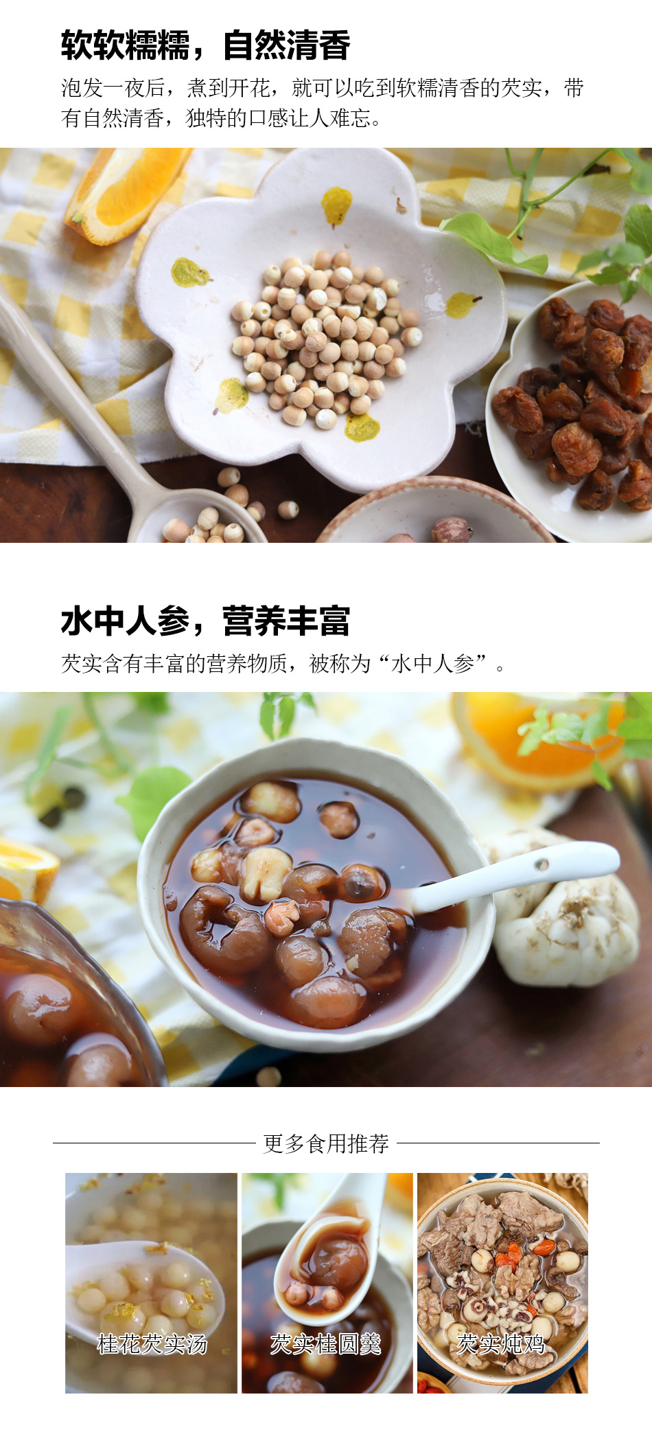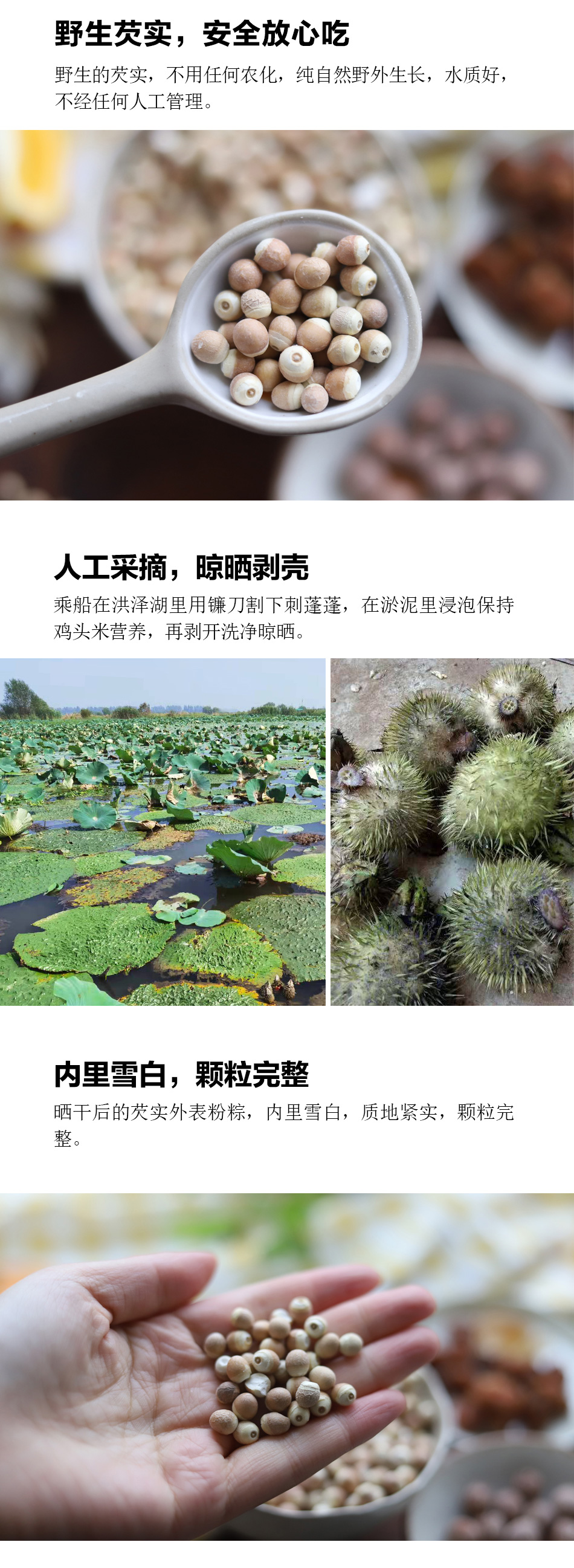 【品名】:野生干芡实 【规格】:300g/罐*1、300g/罐*2 【新农人】:孙梓航 【产地】:江苏省宿迁市泗洪县临淮镇洪泽湖 【种植标准】:野生采割,人工剥壳晾晒,不熏硫 【生产日期】:见包装 【保质期】:12个月 【保存方法】:阴凉干燥密封,尽快食用 【食用方法】:提前泡发一夜,炖煮3小时左右。可搭配桂圆、红豆、桂花等食用。 【注意事项】: 1.野生芡实,带有轻微在水里发酵的味道儿(有点水臭味儿,泡洗后就好啦),介意慎拍;2.芡实很容易受潮,请密封干燥储存,一定要注意防潮,开封后尽快食用。 3.受天气或库存等原因影响快递可能偶有耽误,急单请发货前咨询客服。本品为生鲜,请勿拒收,拒收则无法进行售后; 4.已发货后不接受没有沟通的退款、退货申请。