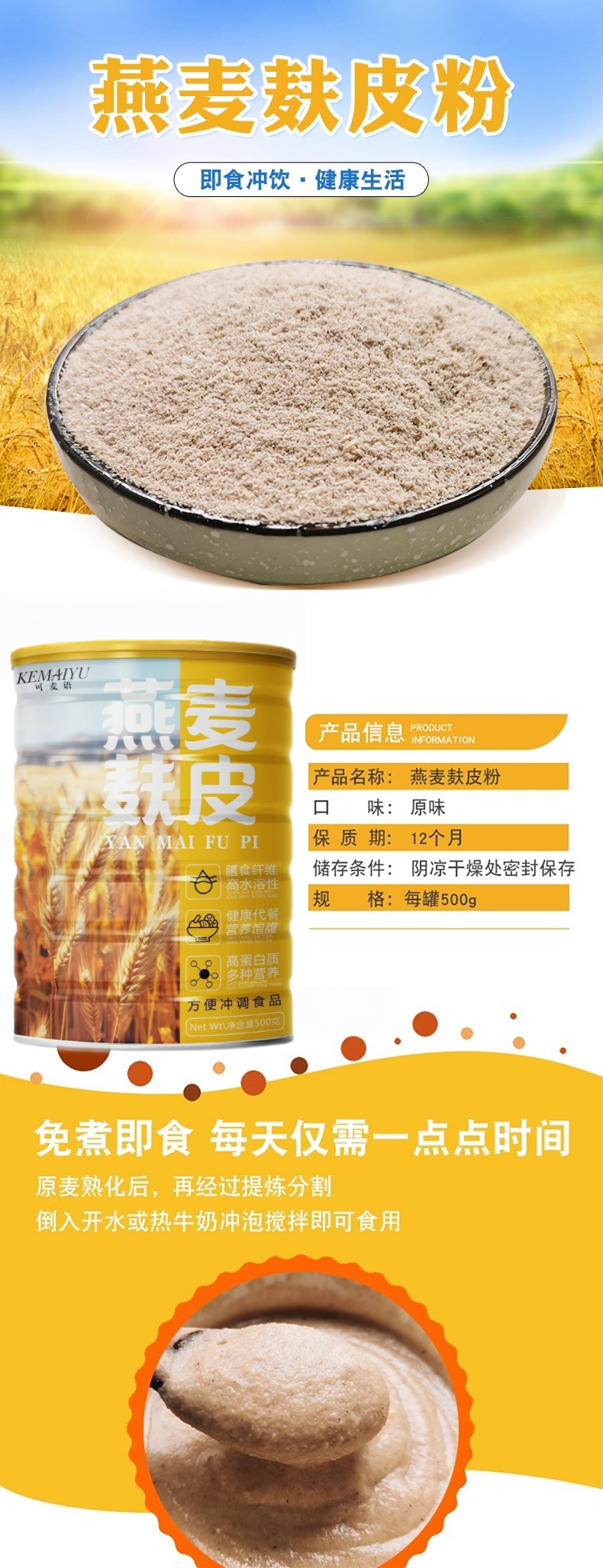 【2罐】燕麦麸皮粉、冲饮即食代餐、无添加蔗糖、原味膳食、500g/罐