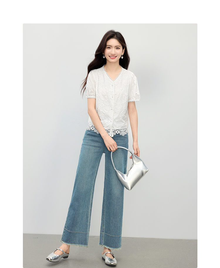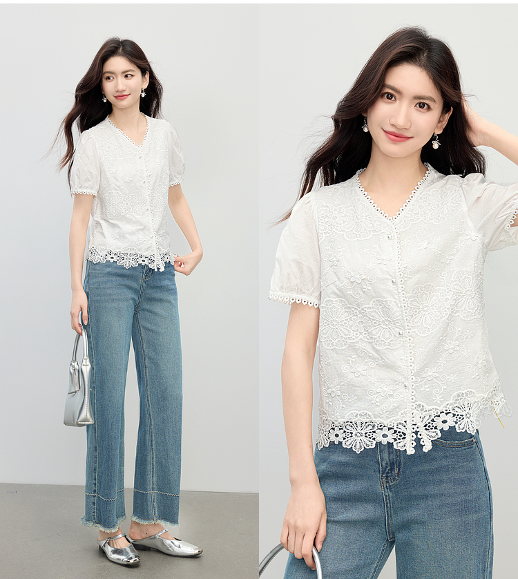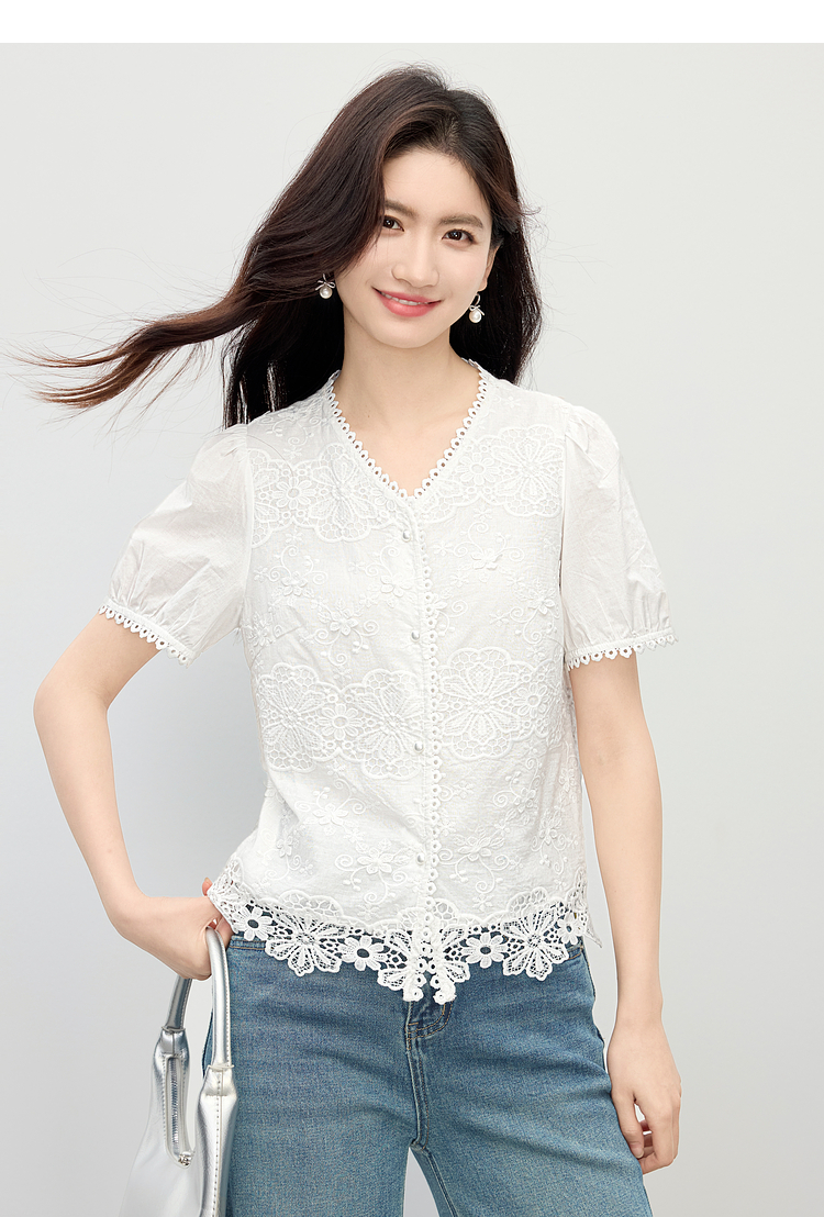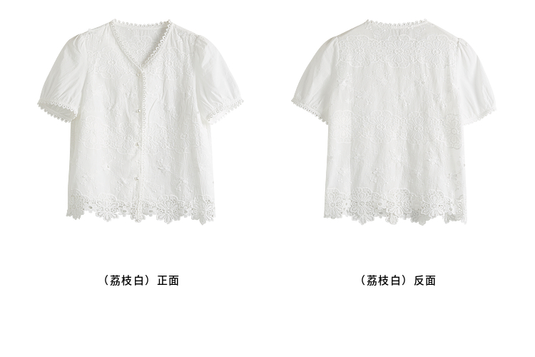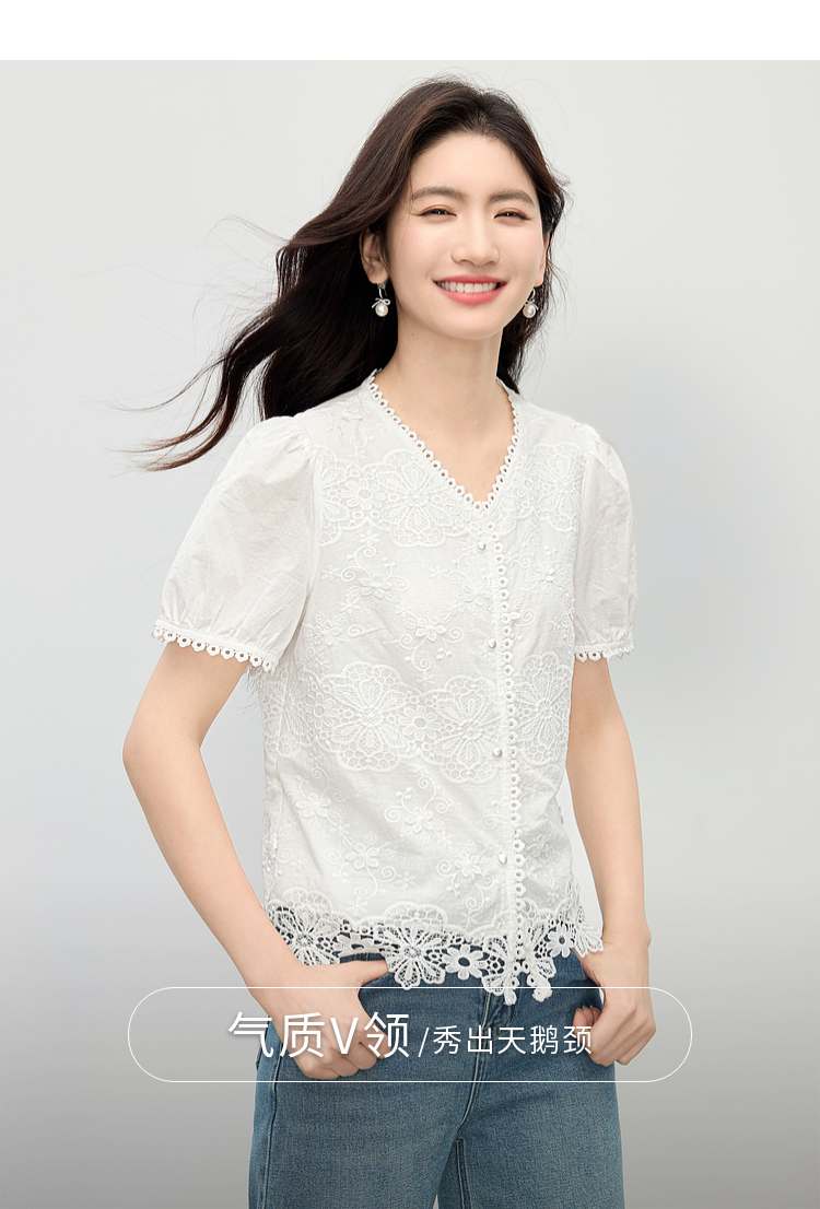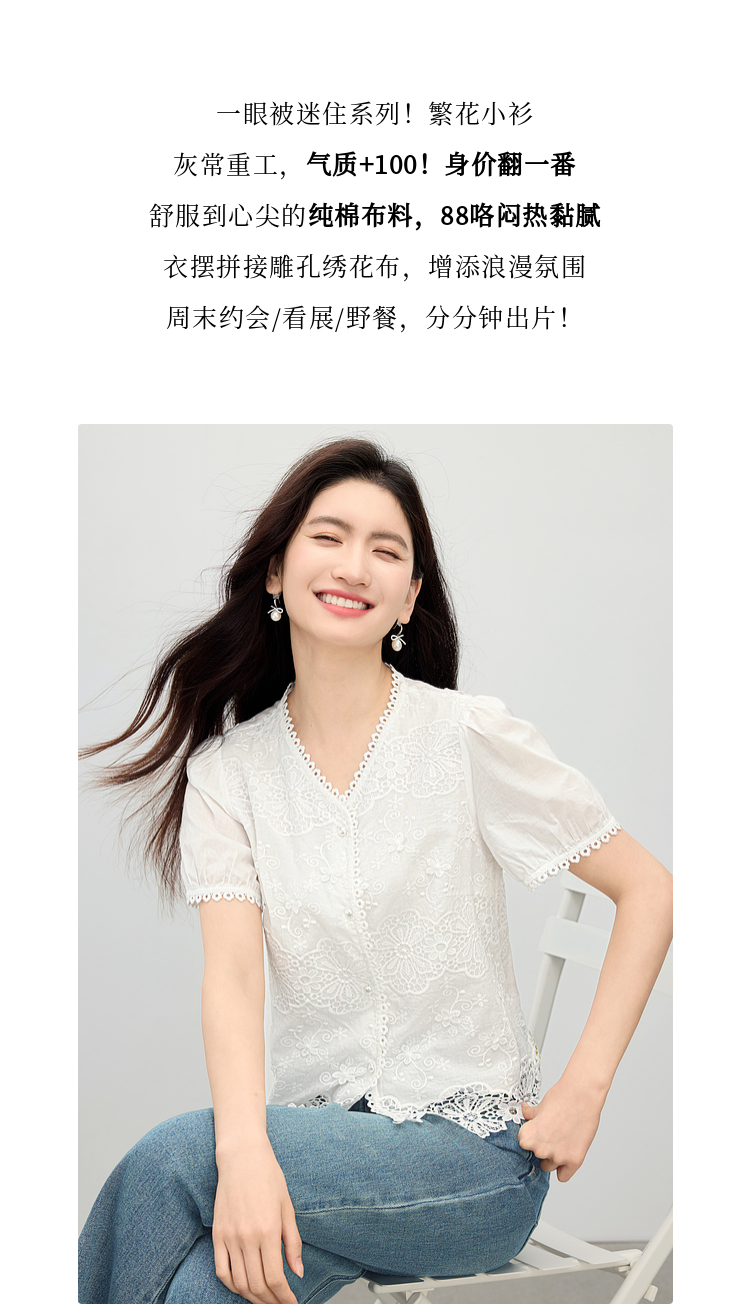 熙世界法式白色蕾丝衫女夏季2025新款设计感下摆花边拼接V领上衣