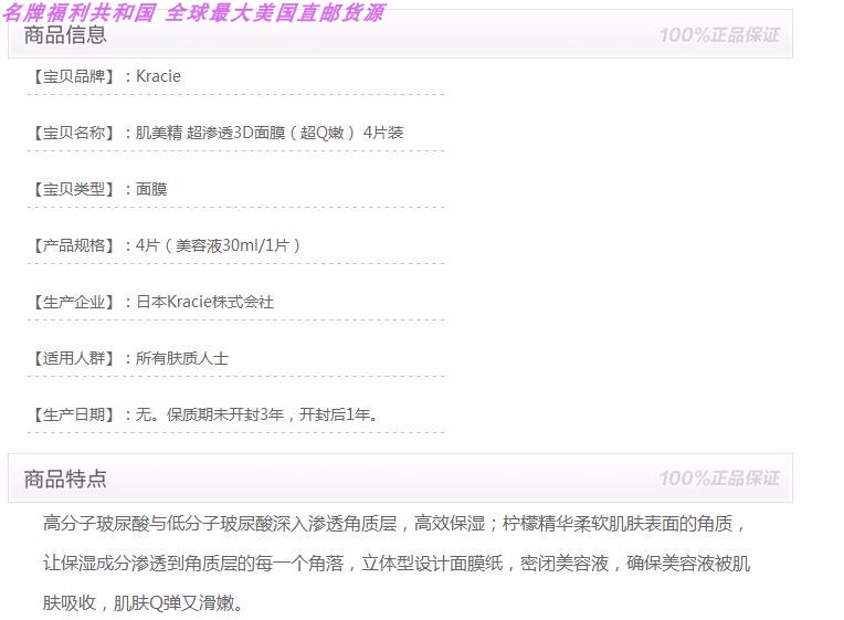 KRACIE/肌美精 超渗透Q嫩3D面膜 橙色 4片JPY带授权招加盟代理