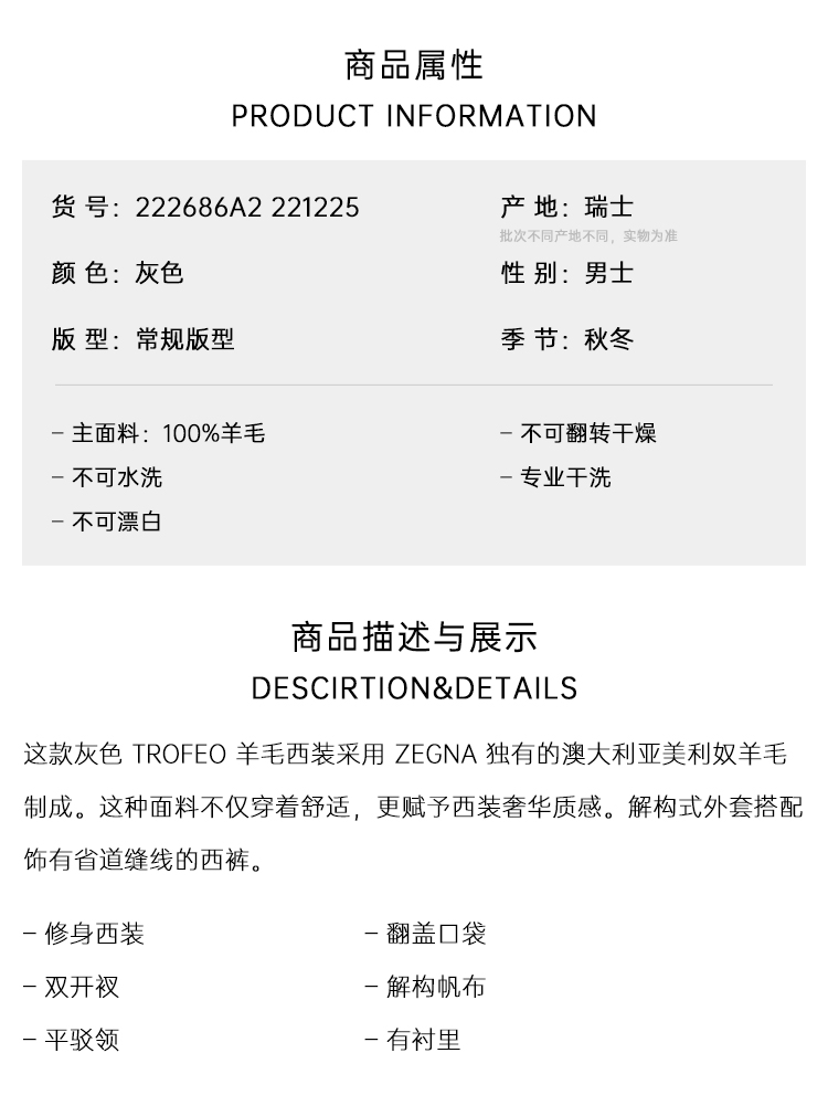 ZEGNA 杰尼亚 男士 Trofeo 羊毛西服套装 灰色 222686A2 221225