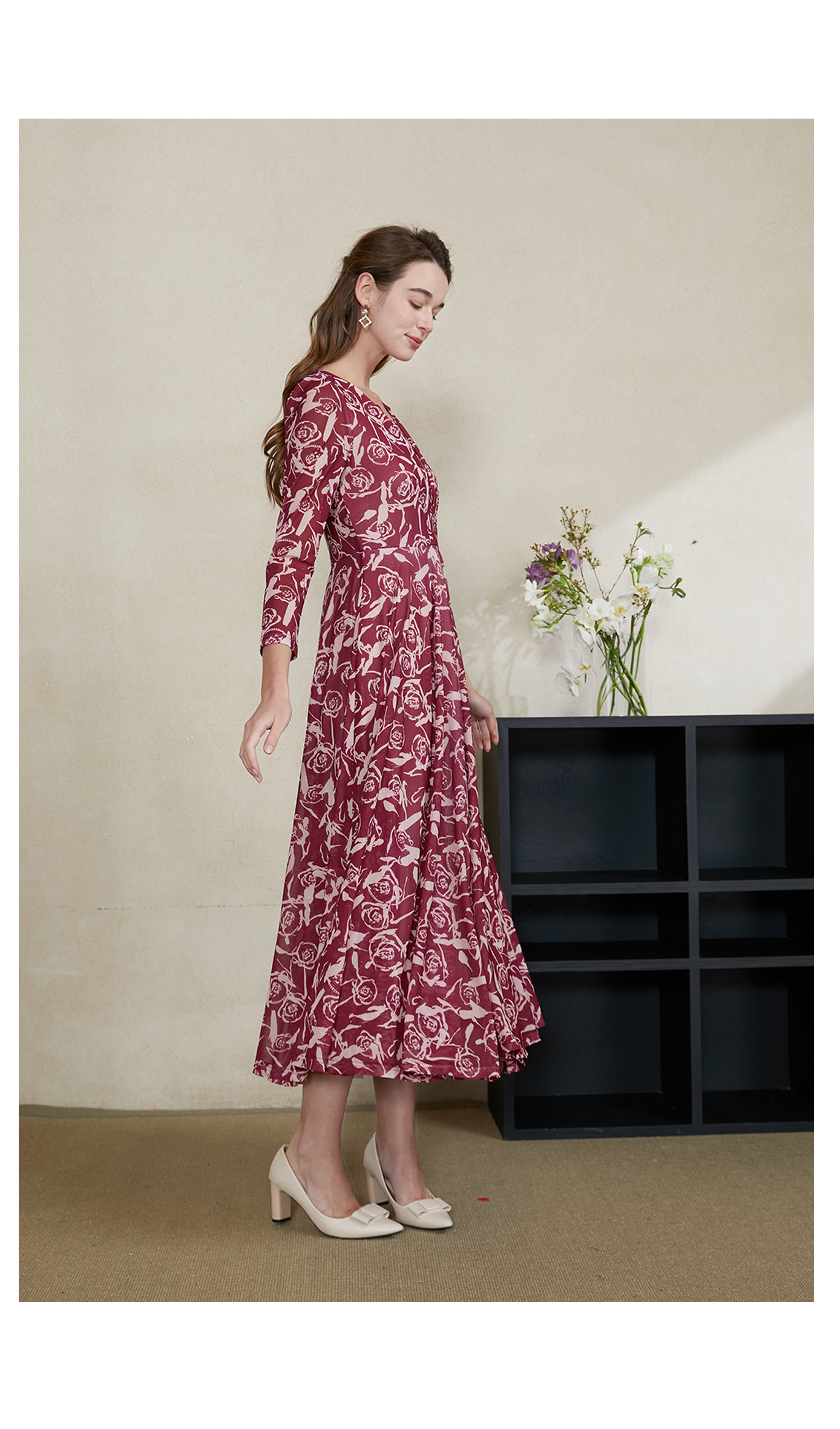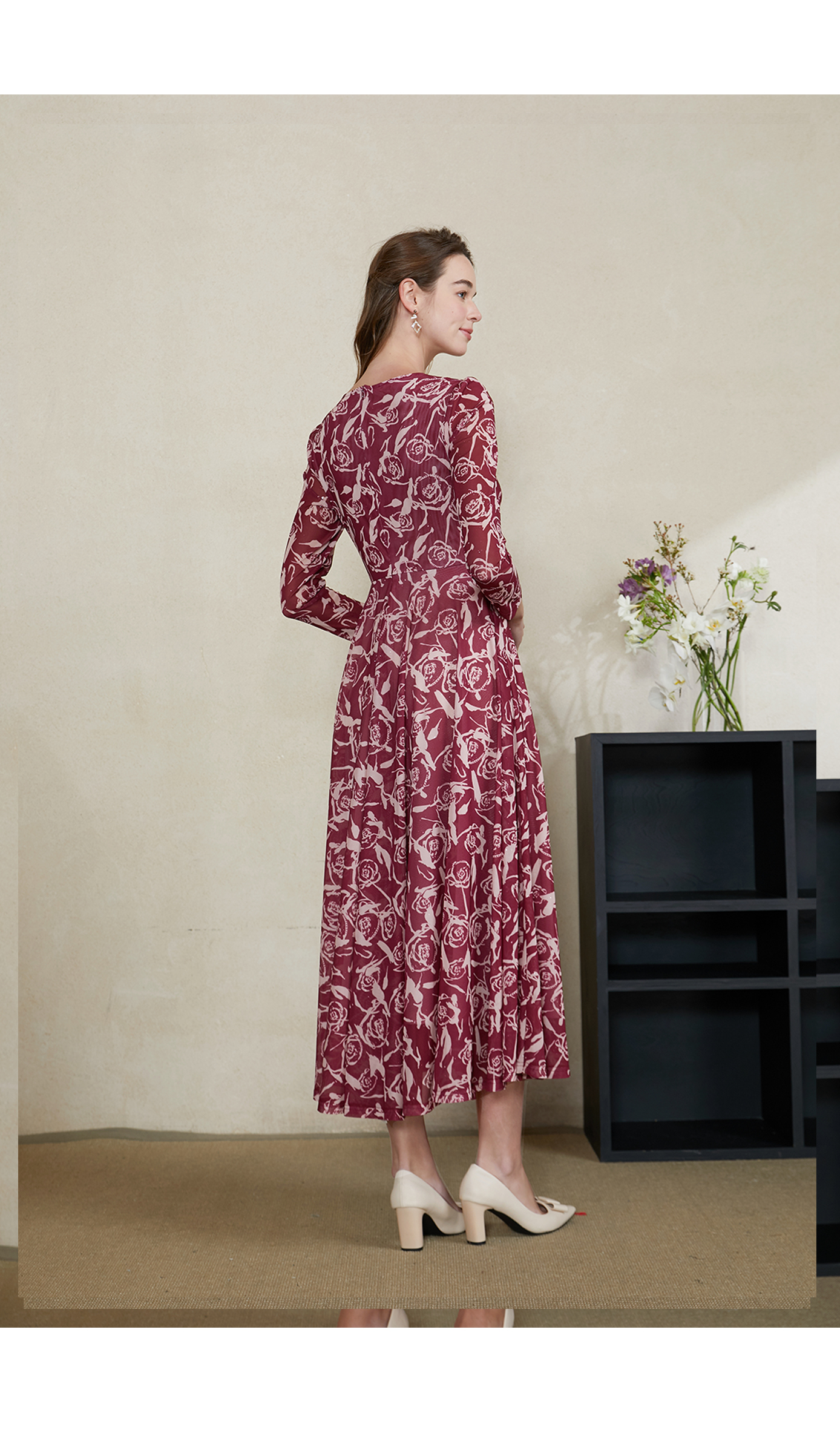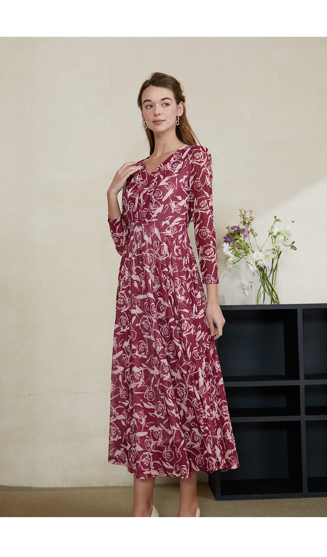 司歌雪纺v领长袖收腰连衣裙EA901375X