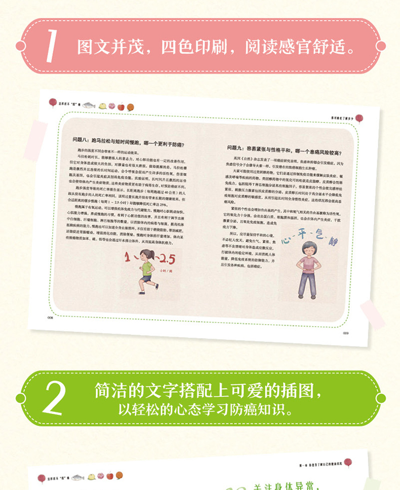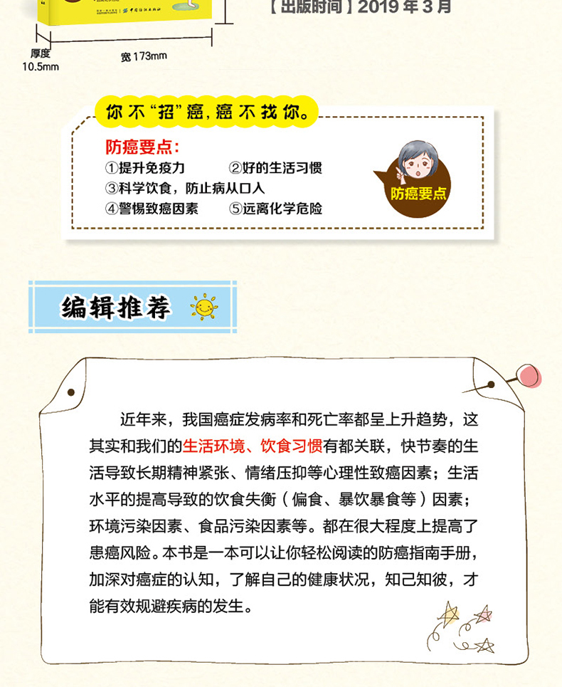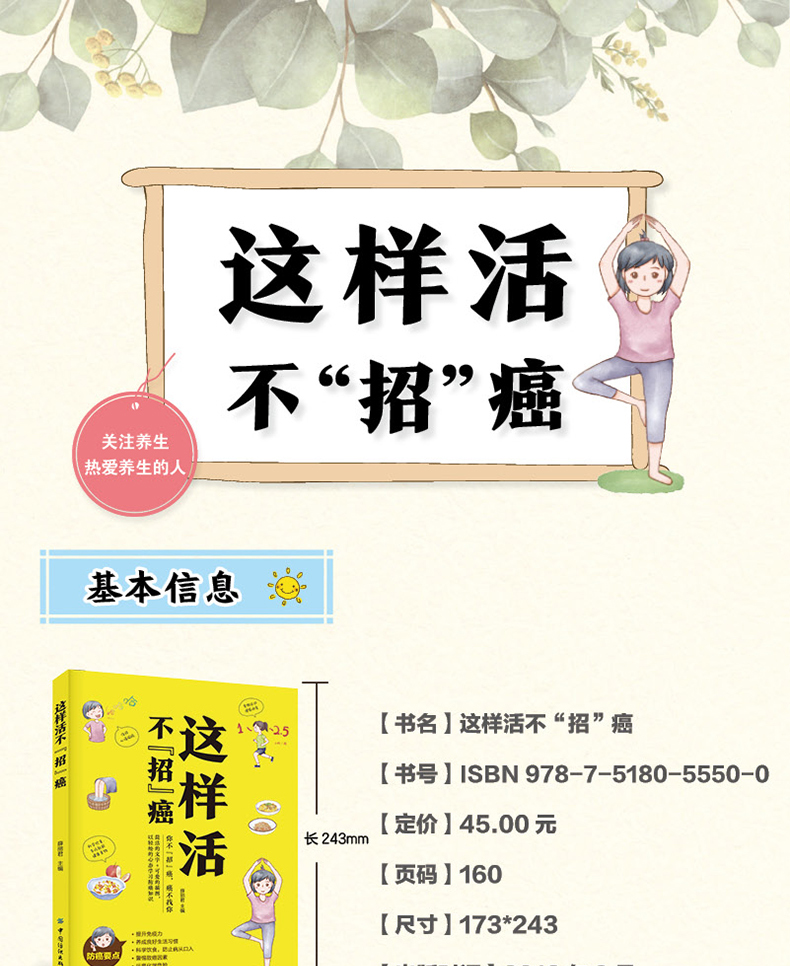 癌症是一种与生活习惯、饮食习惯、生活环境、遗传基因等均有一定关系的疾病,正因为病因复杂,因此,预防癌症的“主动权”掌握在我们自己手中。这样活不“招”癌以科普的形式,介绍了100个关于如何预防癌症的常识,内容涉及生活、运动、饮食、化学物质接触等等。每个常识的解读并非泛泛而谈,而是具有科学依据和研究数据作为支撑。读完本书,你会获得对于癌症的全新认识,学会简单实用的抗癌知识。