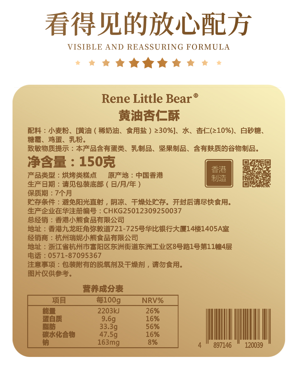 【顺丰包邮】Rene Little Bear 香港小熊 黄油杏仁酥 150g A-5093