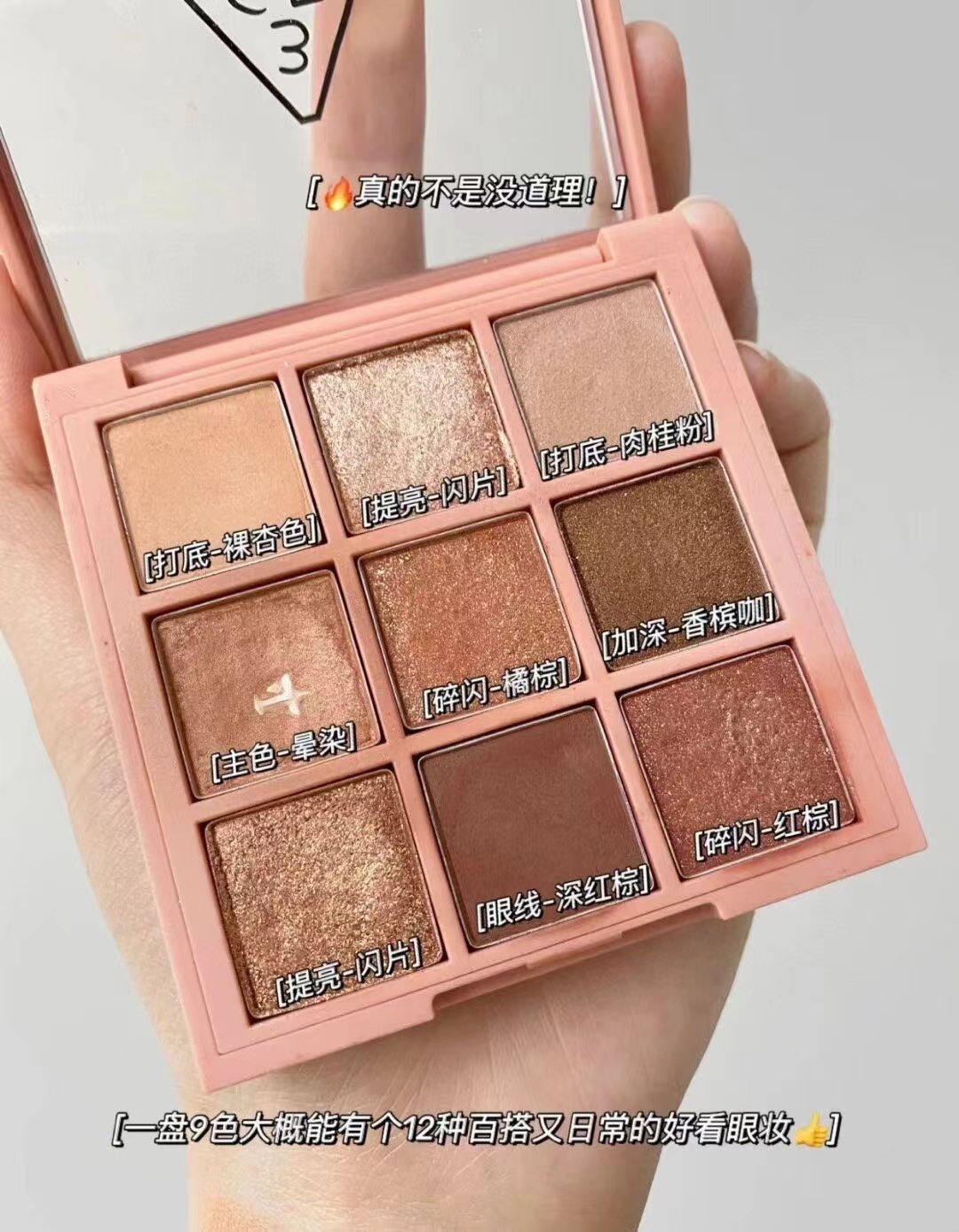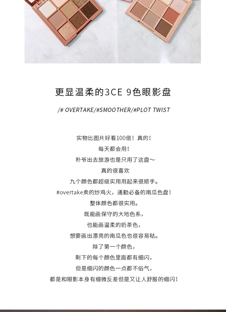 【现货】爆款韩国3ce九色九宫格珠光哑光眼影大地色南瓜色 #overtake