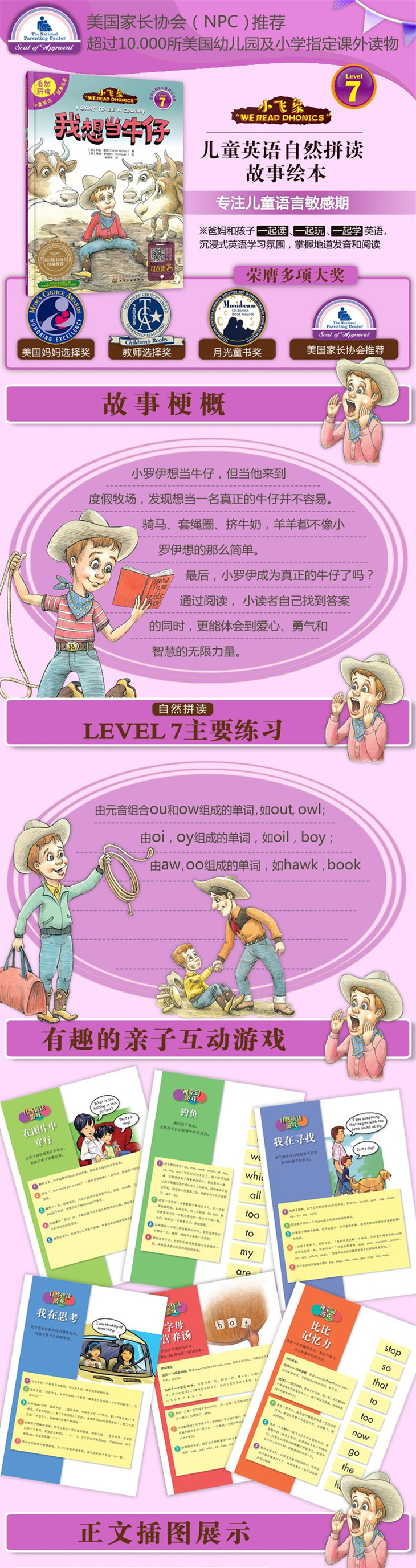 4.一本书三种用法。既可以作为孩子学习自然拼读的学习资料,也可以作为亲子阅读的故事读本,亦可以成为亲子互动游戏的好素材。