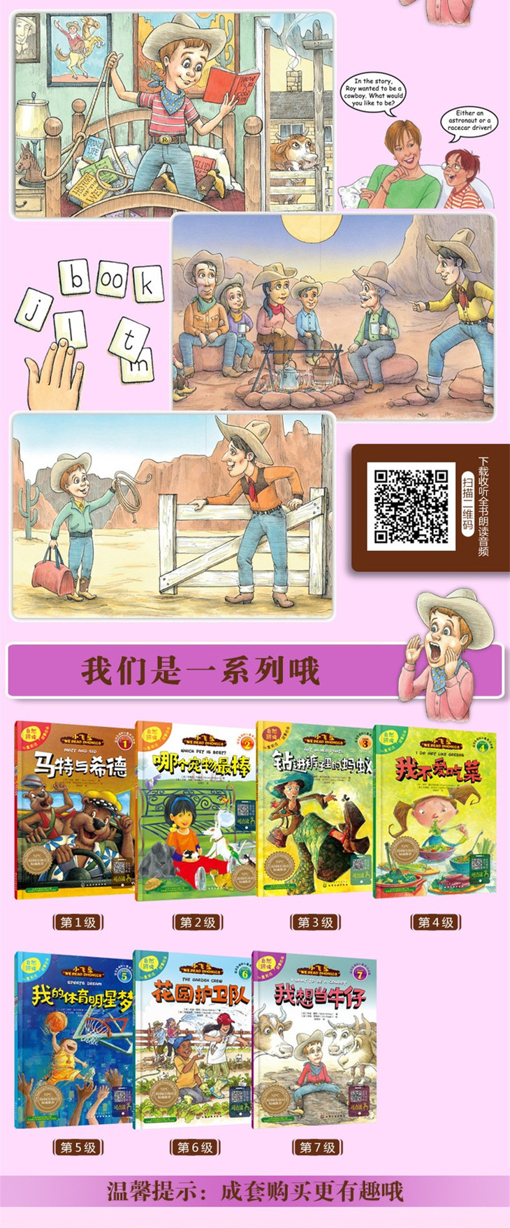 1.循序渐进的自然拼读。英语母语儿童必学的自然拼读法,按照难易程度分为7级,由浅入深,将自然拼读规则融入轻松有趣的故事中,故事中使用大量蕴含发音规则的单词,通过多次重复,让孩子更容易接受和掌握自然拼读法,同时提高英文阅读水平。