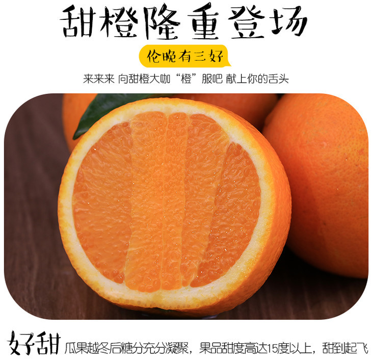 伦晚脐橙9甜1酸的口感,吃起来觉得酸的朋友可以常温放段时间再吃,常温放几天会脱酸变的接近纯甜一点