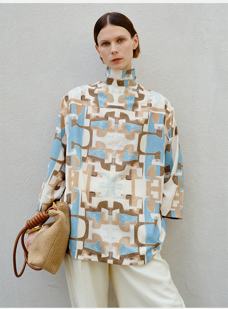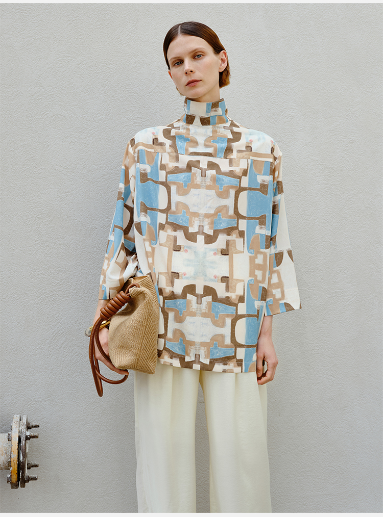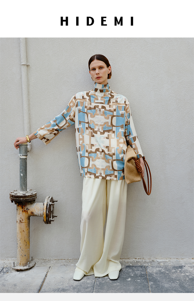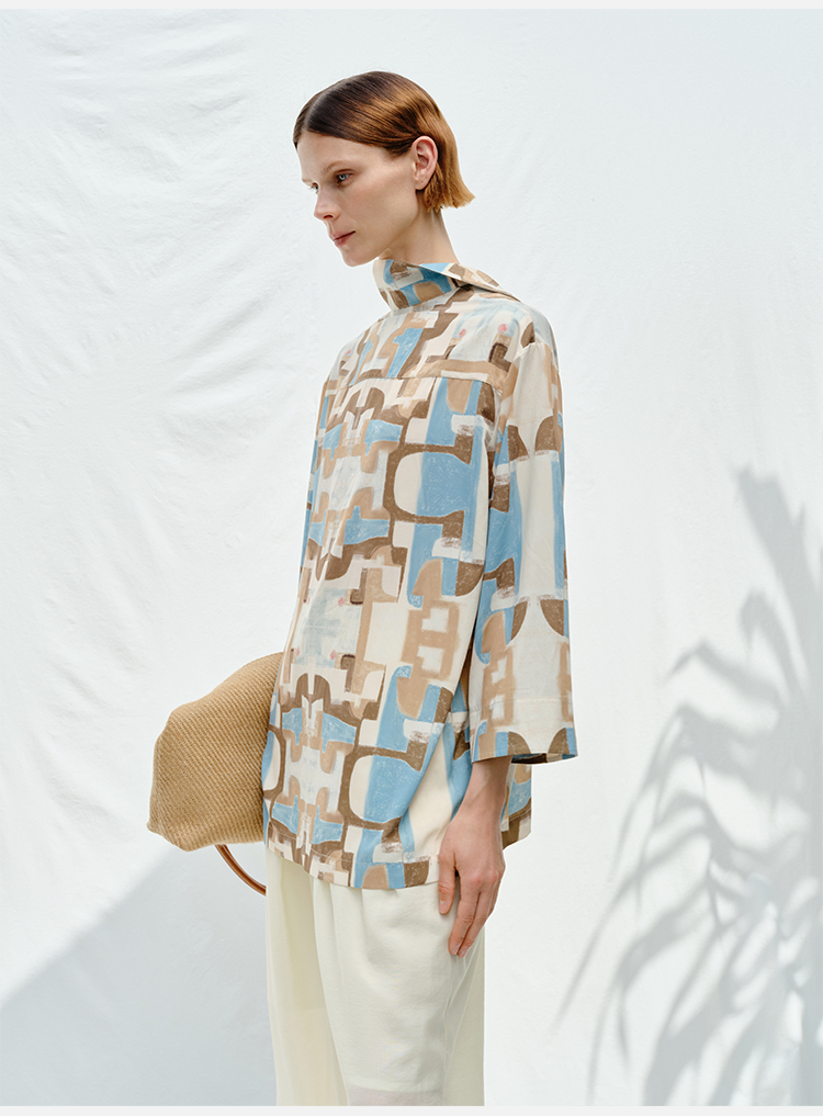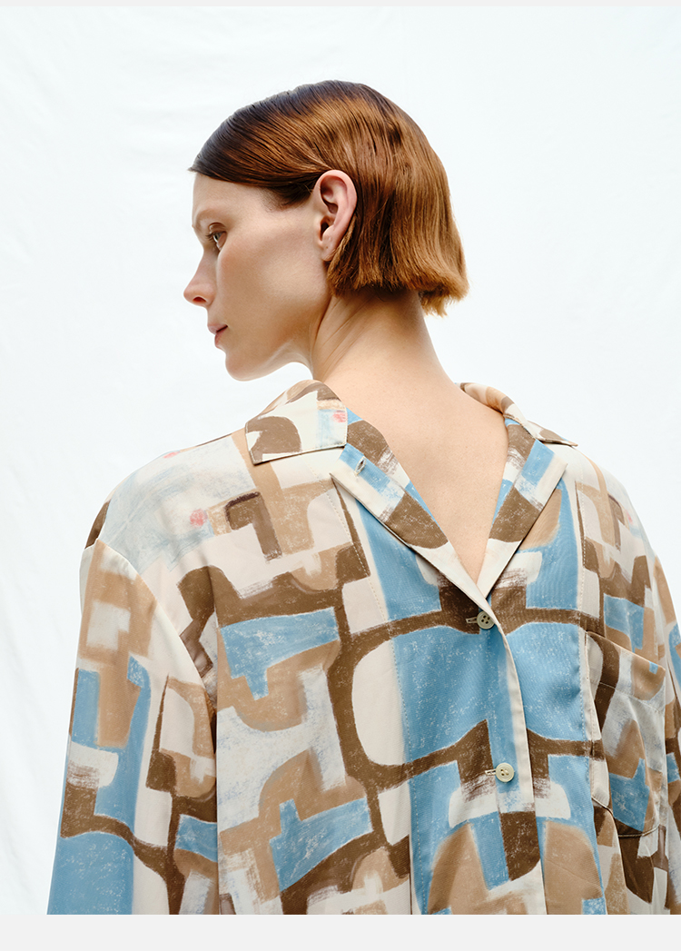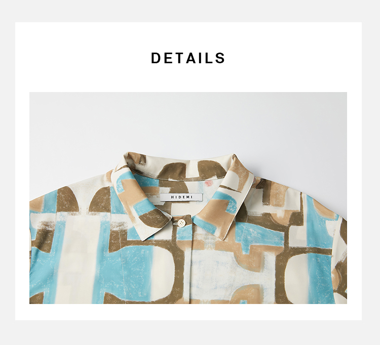 HIDEMI 抽象油画印花缎面古巴领衬衫