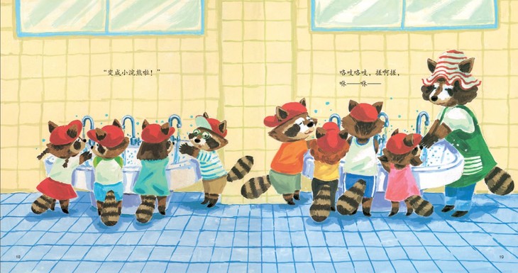 那么,故事这就讲完了吗?NO,NO,NO。不经意地翻过书页……哈哈,快瞧,午休时间,孩子们的睡姿千姿百态,模样也各种各样,变成了蝙蝠、小猴子、小猪、小浣熊!不难想到,睡梦中,孩子们又回到了想象的世界,并乐在其中,让读故事的我们也觉得意犹未尽。