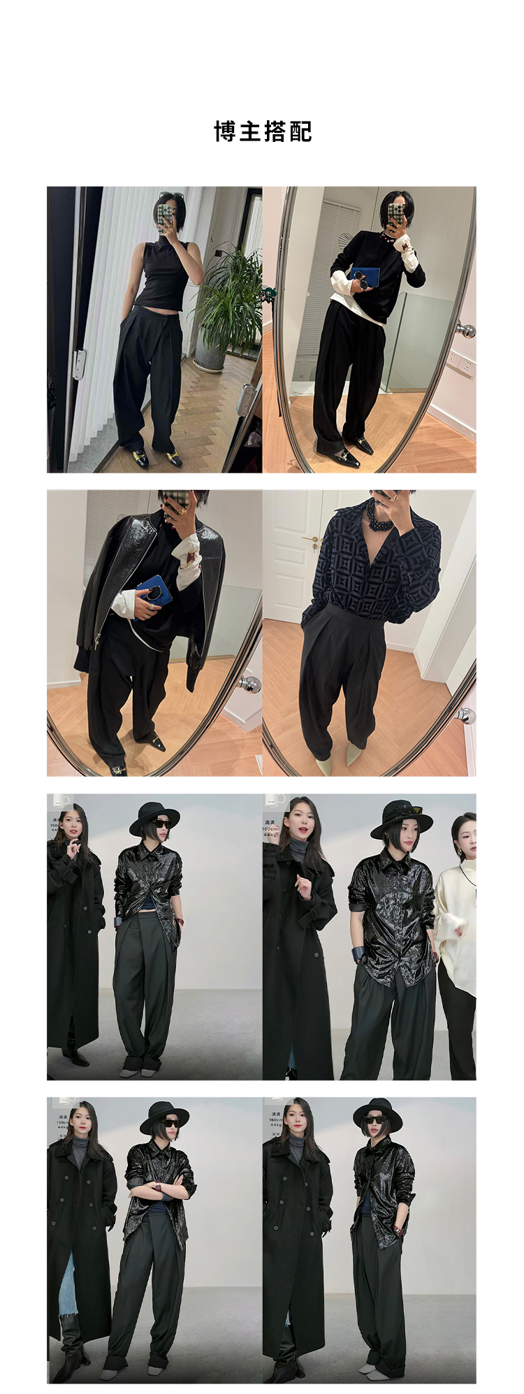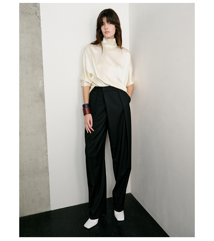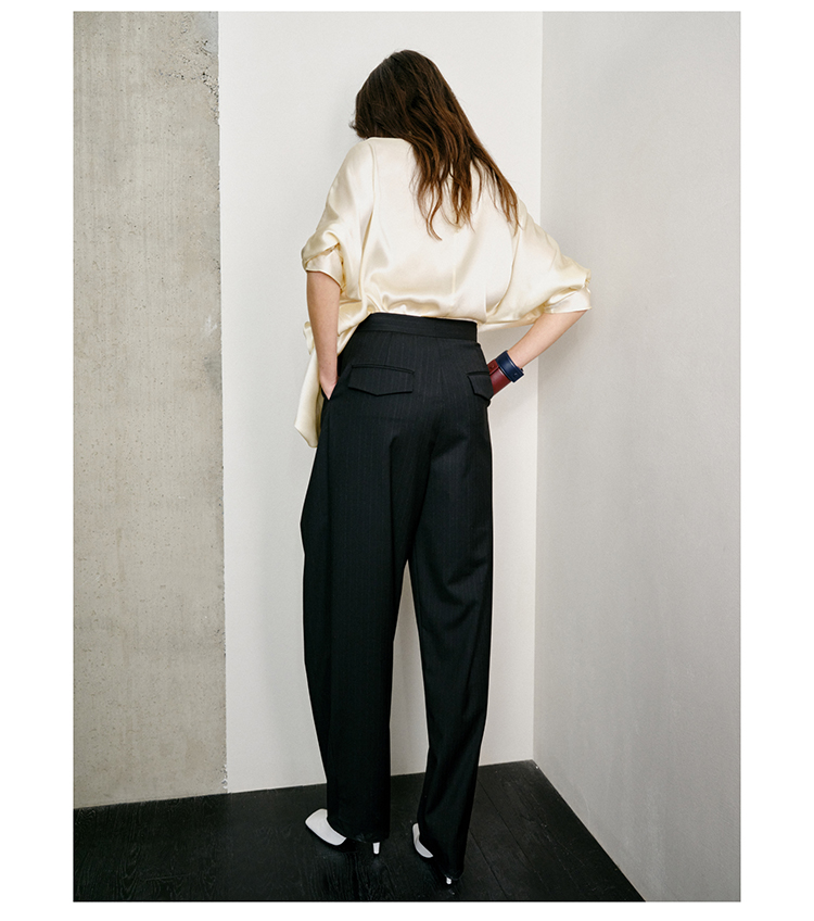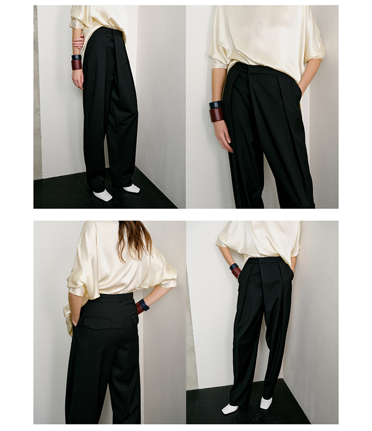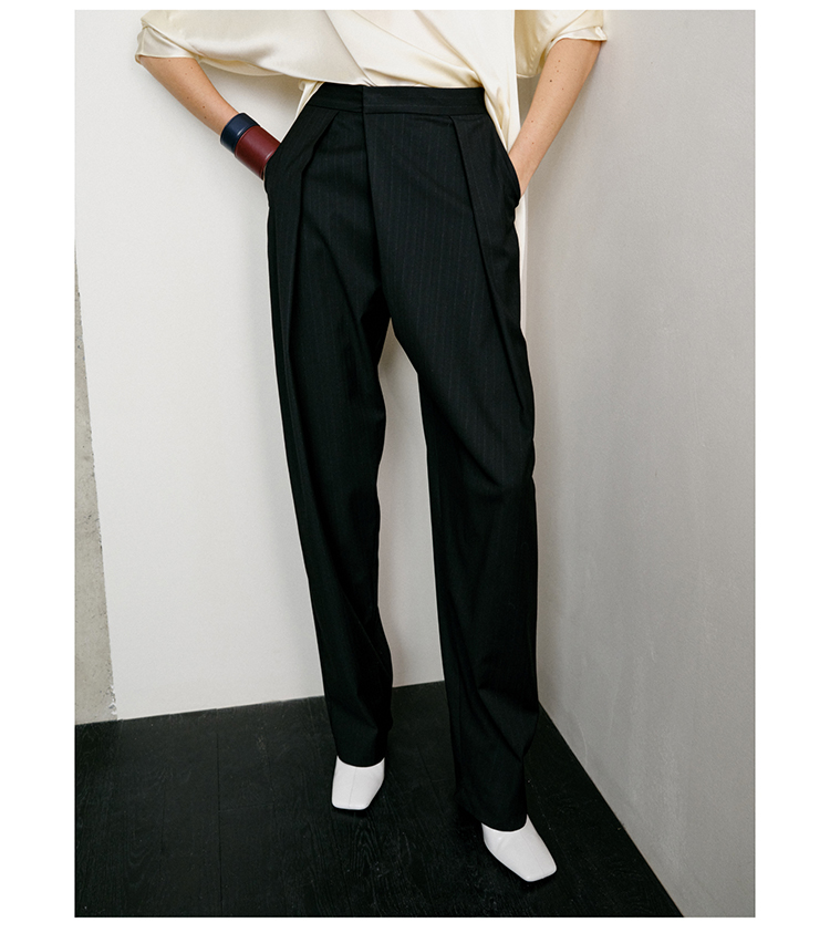 HIDEMI 节日系列极简不对称设计感色织银线细条纹压褶锥形西裤萝卜裤长裤