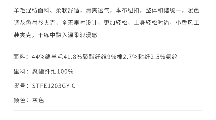 callisto灰色绵羊毛混纺夹克棉夹克 STFEJ203C