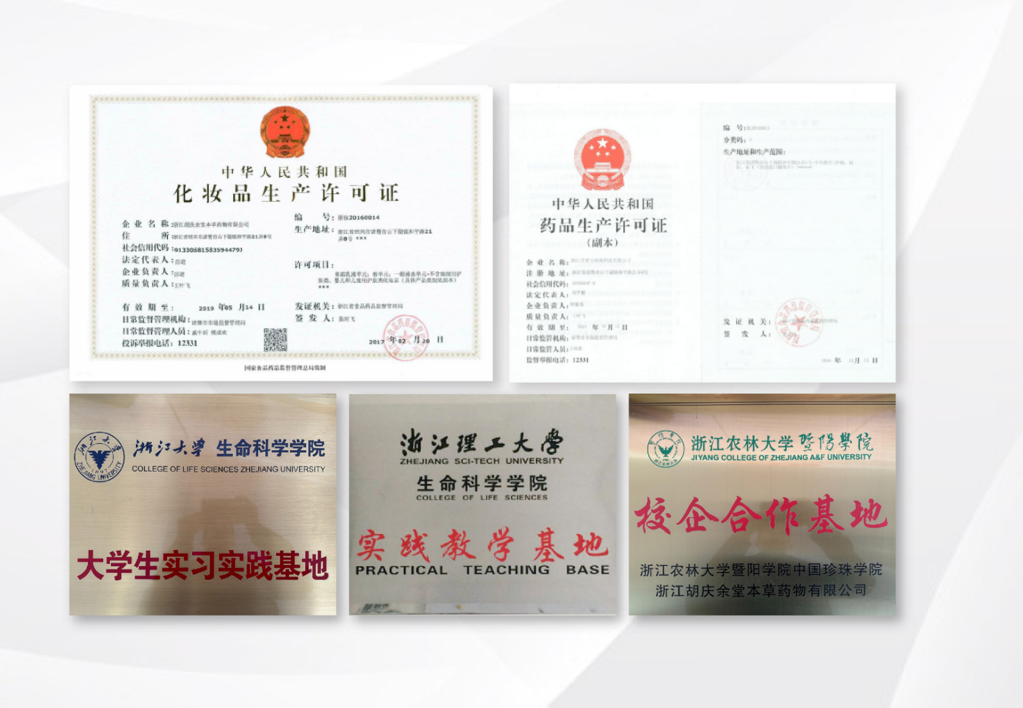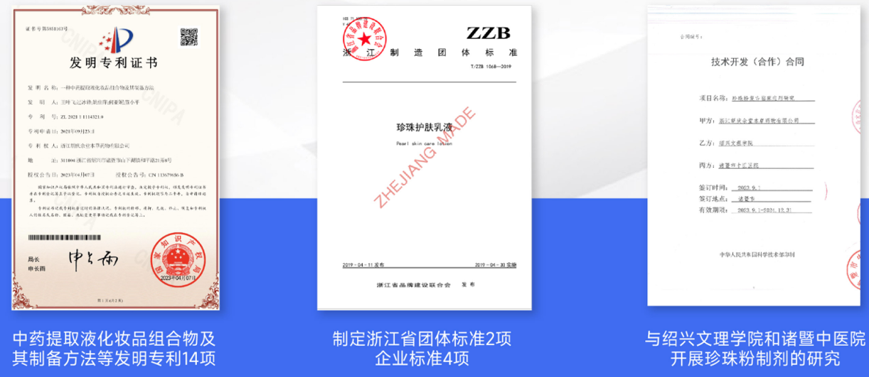 公司已经取得了药品生产许可证和化妆品生产许可证,与浙江大学、浙江理工大学、浙江农林大学、绍兴纹理学院开展校企合作、重点研究珍珠粉处方组成以及美白祛斑功效。