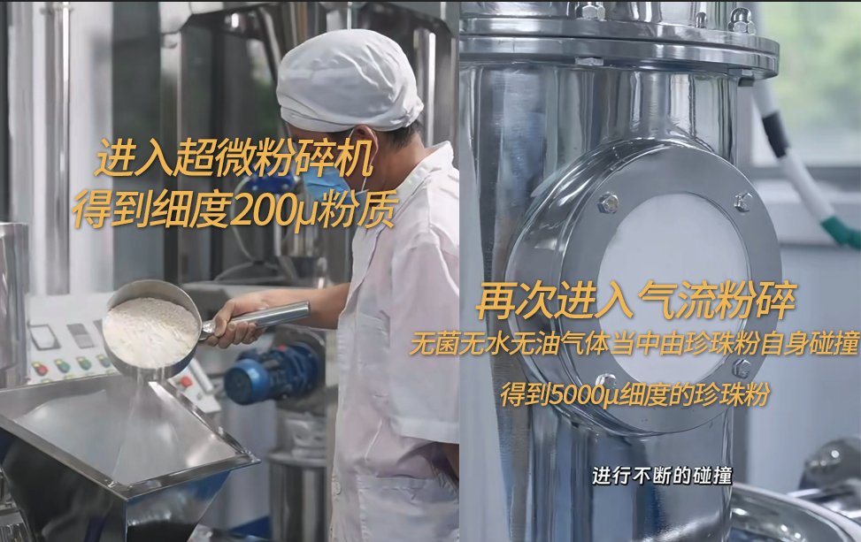 在无菌无水无油的气体当中,通过珍珠自身碰撞与摩擦,从而的到5000μ细度的细珍珠粉!