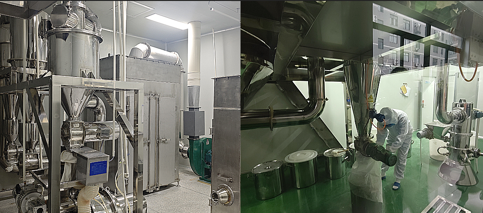 进入超微粉碎机里面粉碎后得到200μ细度,已经符合国家药典的标准.