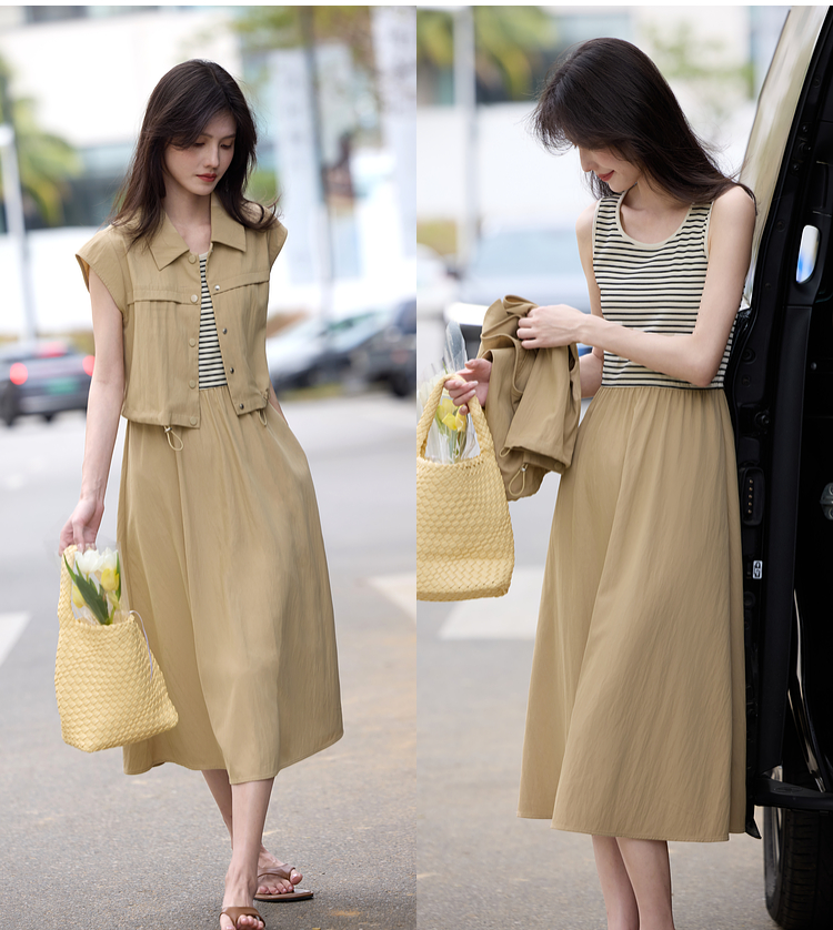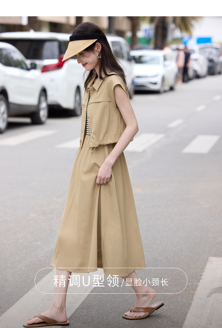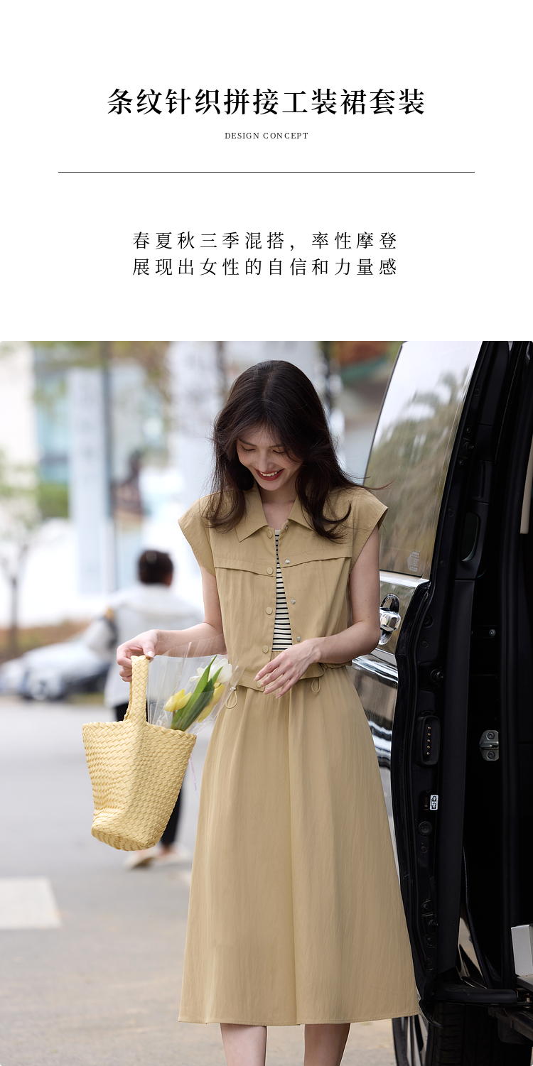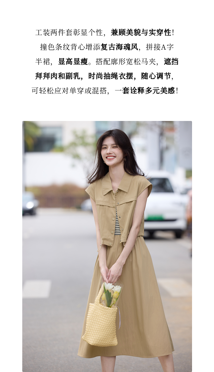 【1件85折】熙世界工装风无袖短外套马甲针织拼接连衣裙两件套装女2025夏新款