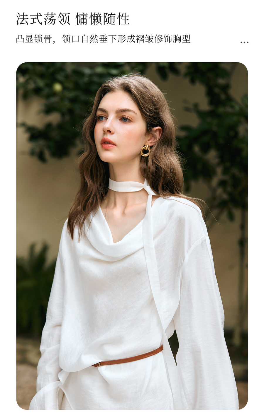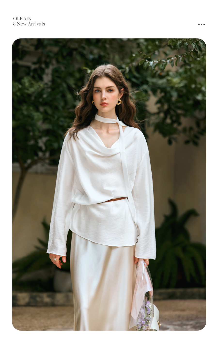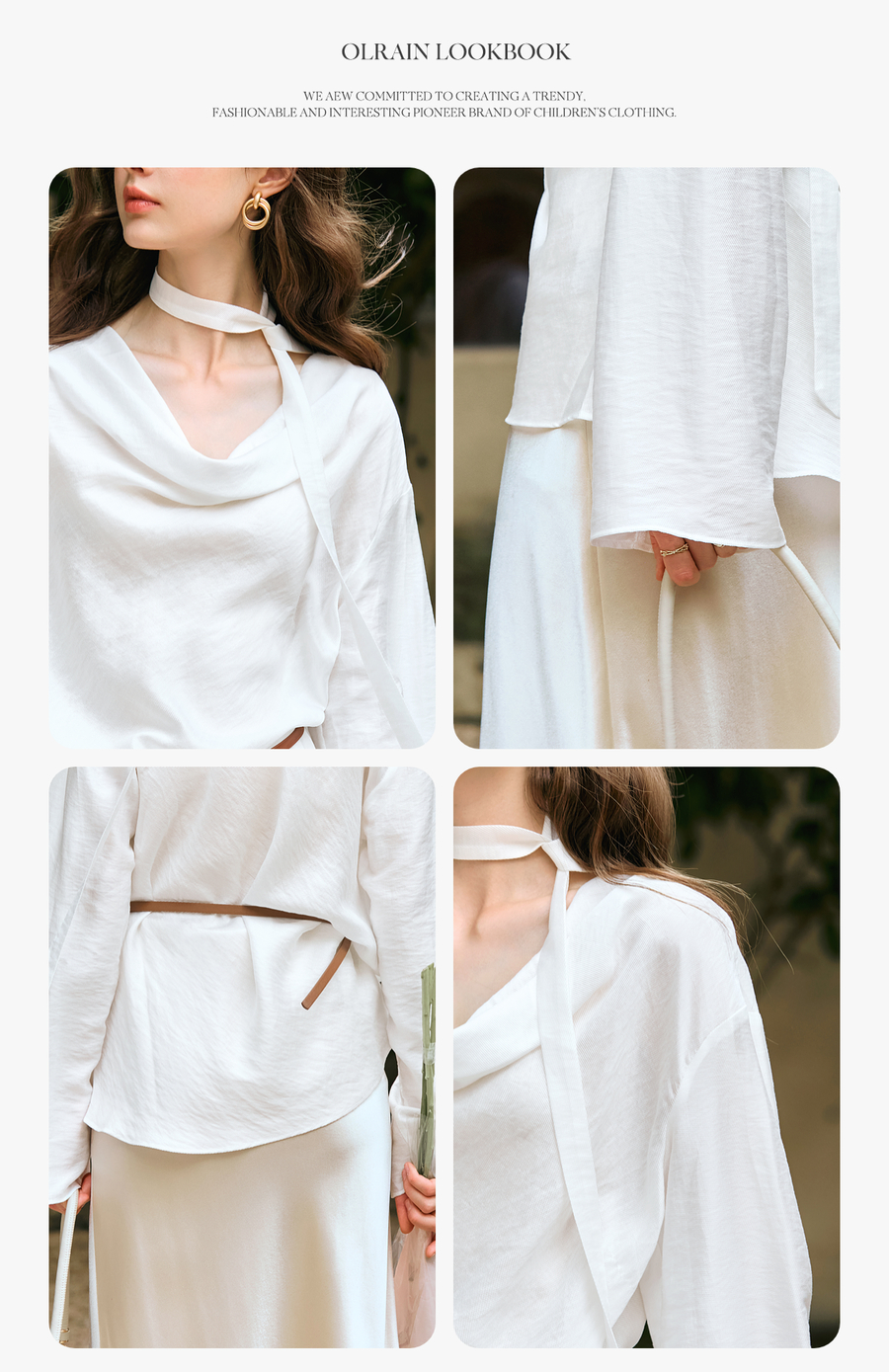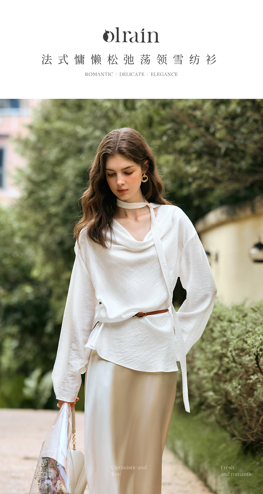 OLrain欧芮儿法式白色雪纺衫女冬季2024年新款慵懒风荡领飘带上衣
